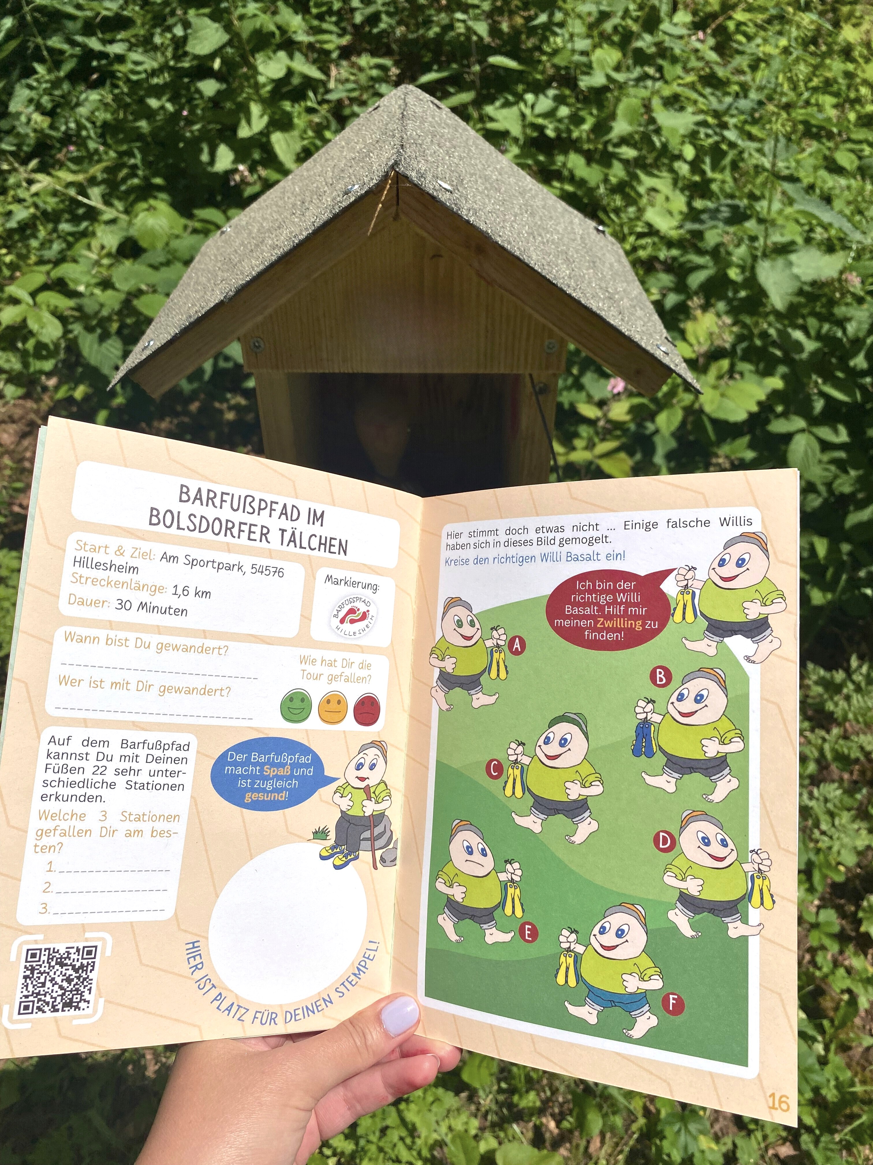 Der Barfußpfad ist 1,6 km lang und hat 22 Stationen. Zunächst führt der Pfad über verschiedene Pflasterbeläge und Sandwege zum See. Hier beginnen, nachdem man eine kleine Abkühlung im Wasser erhalten hat, die Etappen über Meersand, Perlkies, Feinsplitt, Grobkies, Lavasand, Baumrindenschrott oder Mulch zur Bachbrücke. Hier geht es entweder durch die Kiesfurt oder über die Brücke und dann über Knüppeldamm, Trittplatten, Rasenbankette und Balancierbalken. Wer Lust hat, nimmt anschließend den Klettersteig zur Kalksteinhöhle und nach einer Wiesenetappe kommt man zurück zum See, wo wieder eine Abkühlung im Wasser angesagt ist. Ihrer Gesundheit zu Liebe: Machen Sie sich auf den Weg!
