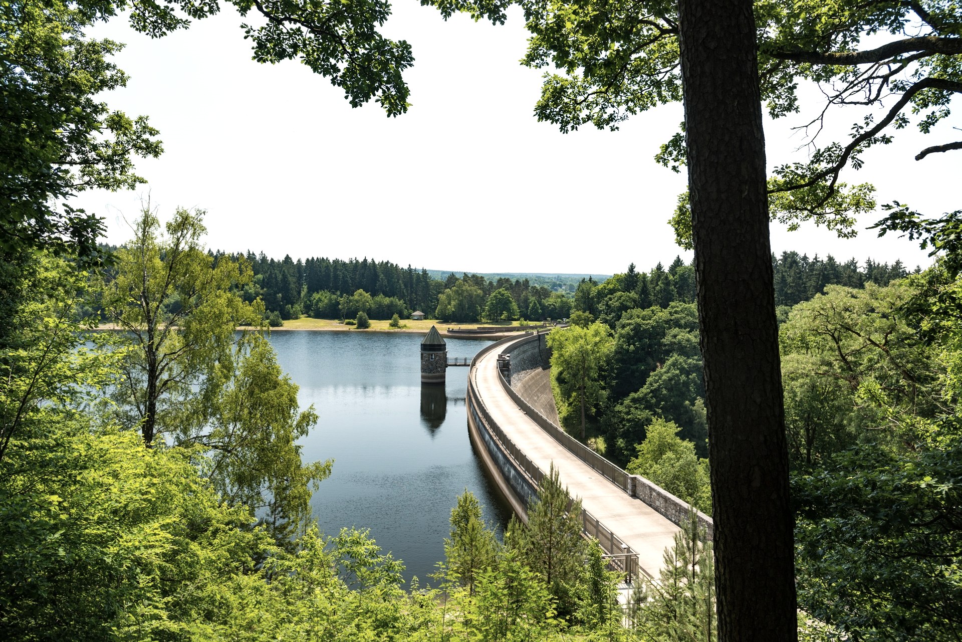 Das Glitzern der glatten Wasseroberfläche der Dreilägerbachtalsperre zeigt Dir den nächsten Weg-Abschnitt. An der Aussichtsplattform kannst Du eine Wanderrast oberhalb des Sees einlegen. Von den vier Elementen, die die Eifel prägen, fühlt sich das Wasser in dieser Region offenbar besonders wohl.