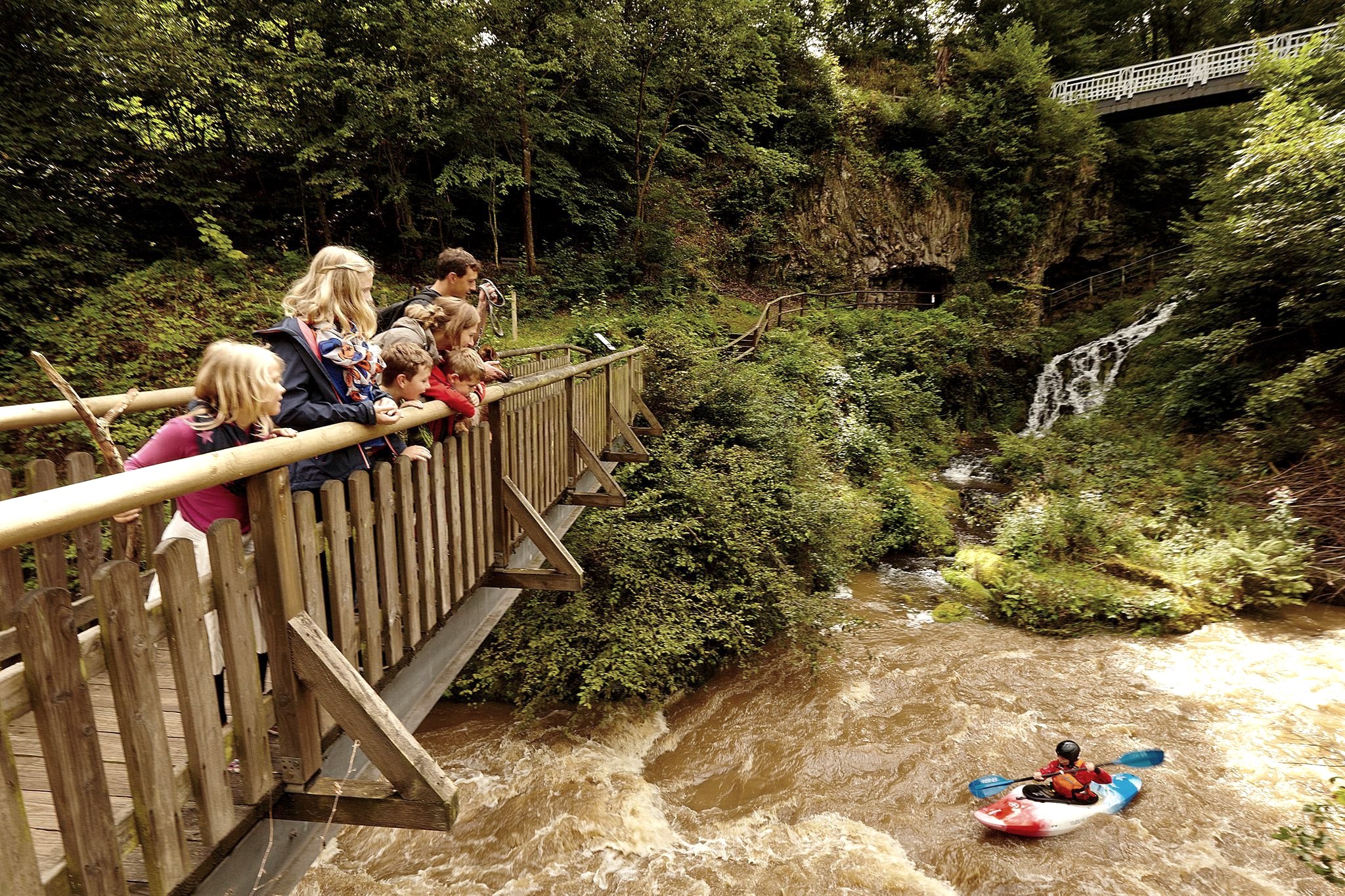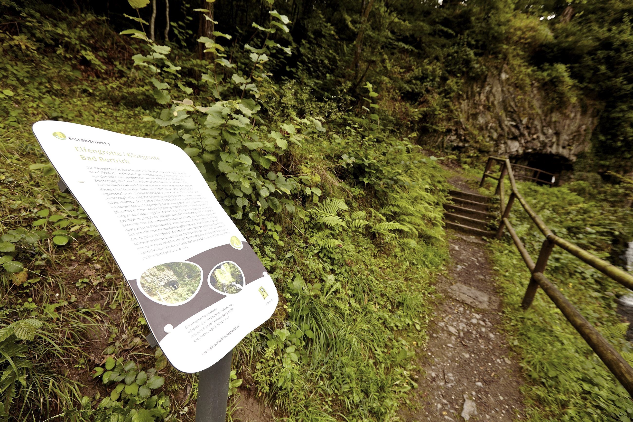 Besonders für kleine GesundLand-Besucher ist die verwunschene Elfengrotte bei Bad Bertrich ein beliebtes Ausflugsziel, denn hier werden vor dem inneren Auge fabelhafte Märchen lebendig. Versinke für einen Moment in sagenumwobenen Geschichten und alten Legenden, wenn du die kleine Grotte besuchst. Die Höhle liegt direkt an der gleichnamigen „HeimatSpur Spazierweg Elfengrotte“, die mit 2,4 km auch für Kinder gut zu meistern ist. Direkt nebenan stürzt mit einem Tosen der Elbesbach-Wasserfall in die Tiefe. Ihren Beinamen „Käsegrotte“ verdankt dieser Ort der Form seiner Steine, die an runde Käselaibe erinnern. Entstanden ist die Grotte vor vielen tausenden Jahren, als glühend heiße Basaltlava von den Höhenvulkanen in das Üssbachtal floss und dort eine einzigartige Landschaft schuf. Beim Erkalten erstarrt die Basaltlava zu Säulen, in der sich horizontale Spannungsrisse entwickelten. Durch die Verwitterung über die Jahrhunderte entstand die Form aufeinandergestapelter Käselaibe, die der Elfengrotte ihre besondere Optik verleihen. (eintragenes Naturdenkmal)