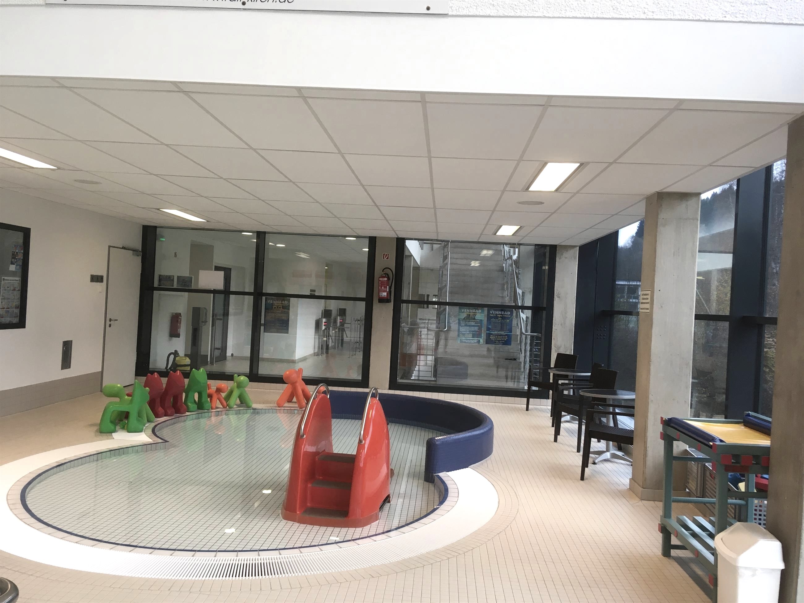 Bei 28,5 Grad Wassertemperatur bietet das 25 Meter-Becken mit Sprungbrett und Drei-Meter-Turm 4 Bahnen. Lehrschwimmbecken und Kinderbecken sind auch vorhanden.