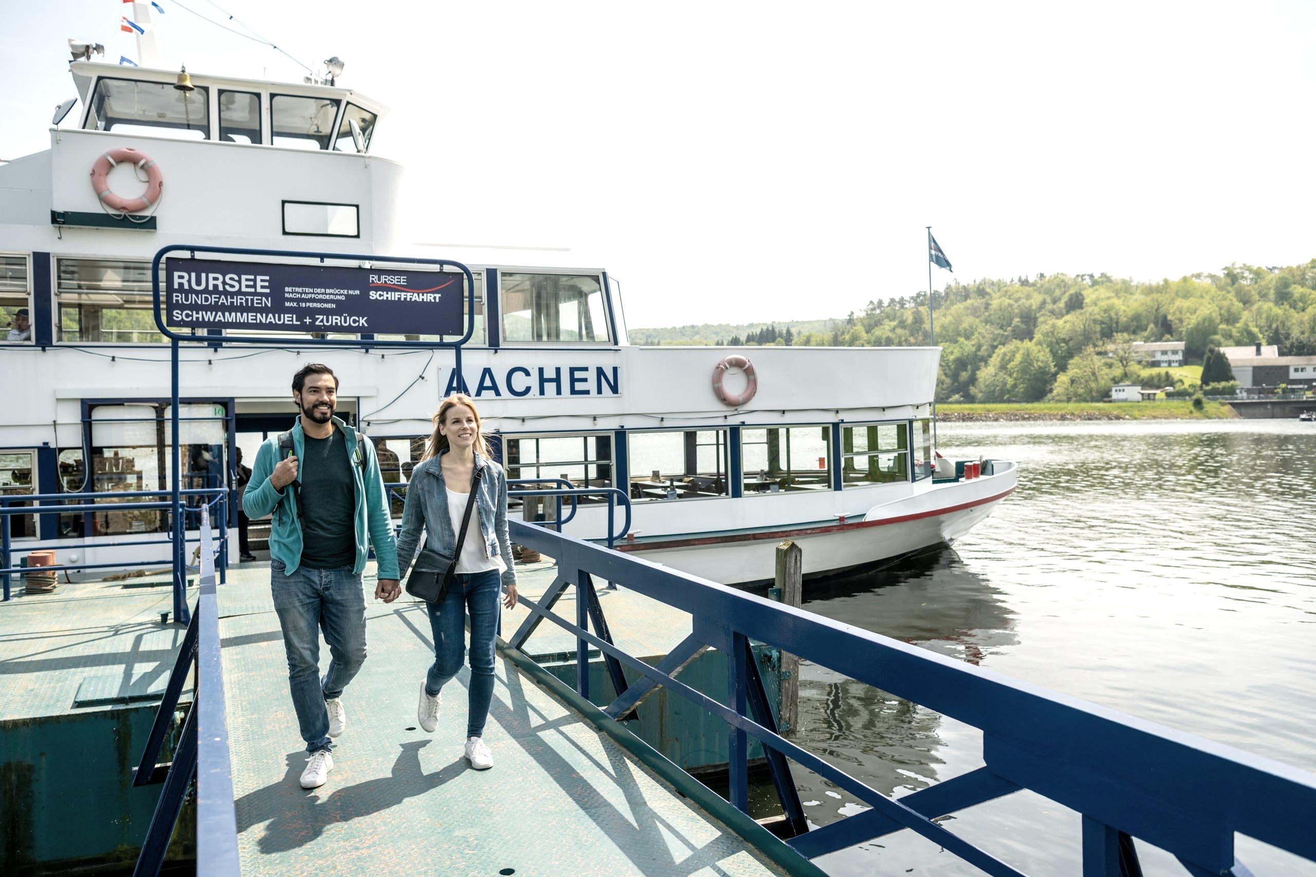 From the pier in Rurberg, you can take a round trip across Lake Rursee from April to October.
