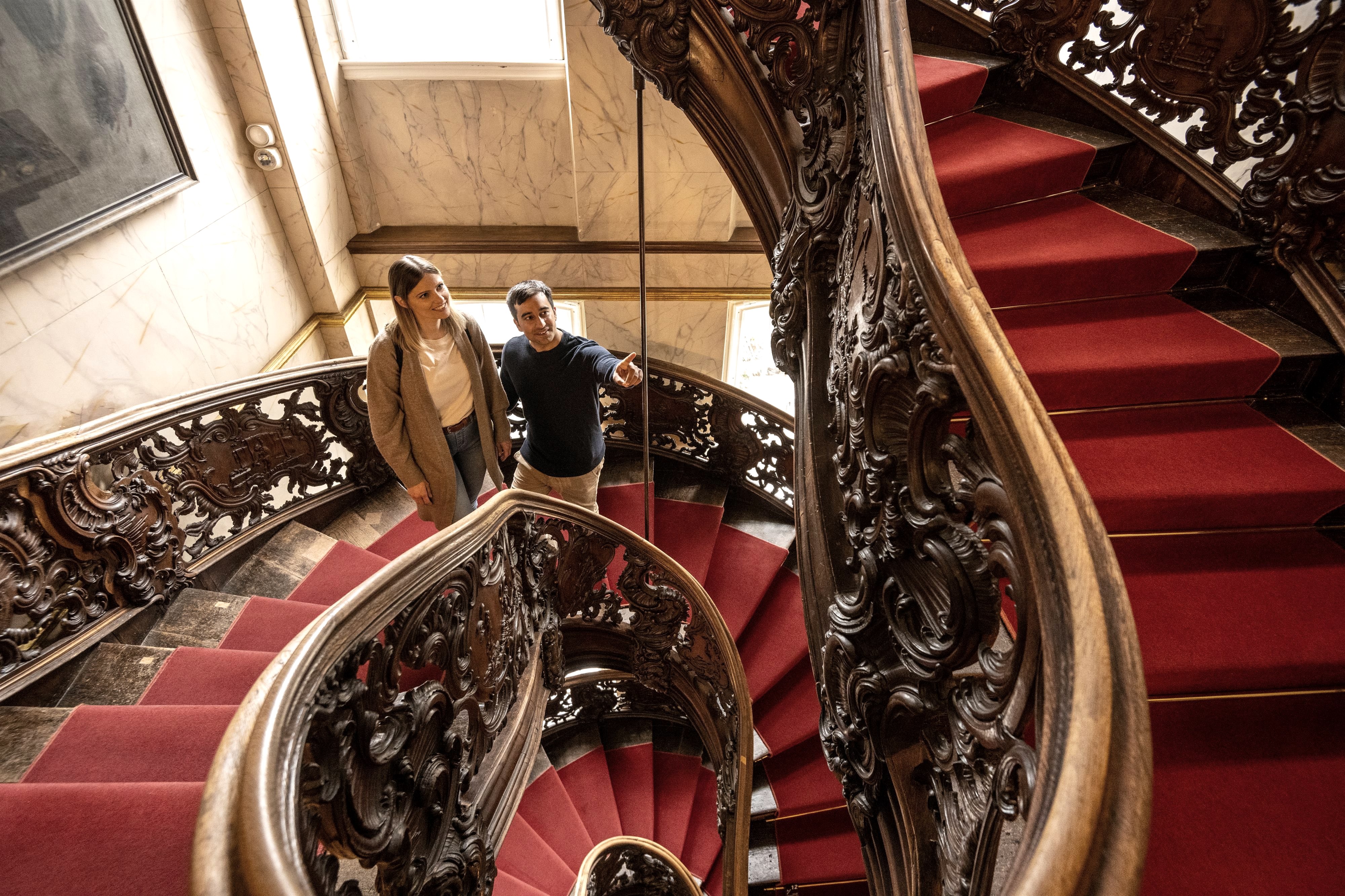 The self-supporting, winding staircase built of oak in which 21 putto scenes depict the different phases of cloth making spans three floors and is world-famous. In the old office rooms, two original, preserved cloth pattern books with a total of 6000 designs in the most varied patterns are testimony of the variety and the superior quality of the cloth traded throughout Europe by his company at that time.