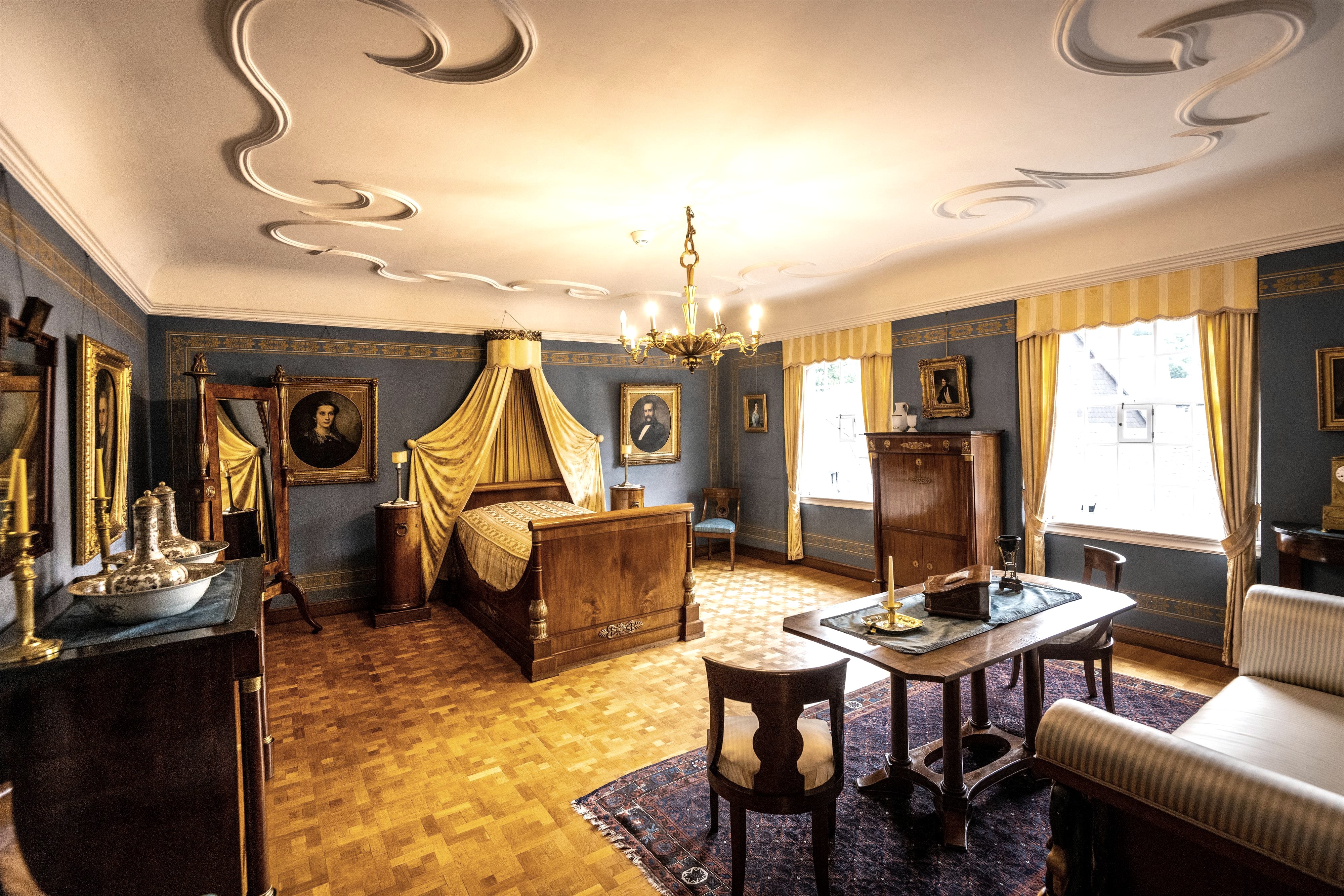 The study with a sumptuous linen wallpaper, the table covered with a marvellous coat of arms service in the dining room, a kitchen with shining brass and copper kettles, drawing rooms with Aachen- Liège writing bureaus, glass cabinets and comfortable lounge suites, a hall with valuable Gobelin tapestry and bedrooms with cradles and wash basins all beckon to a journey into the 18th century.