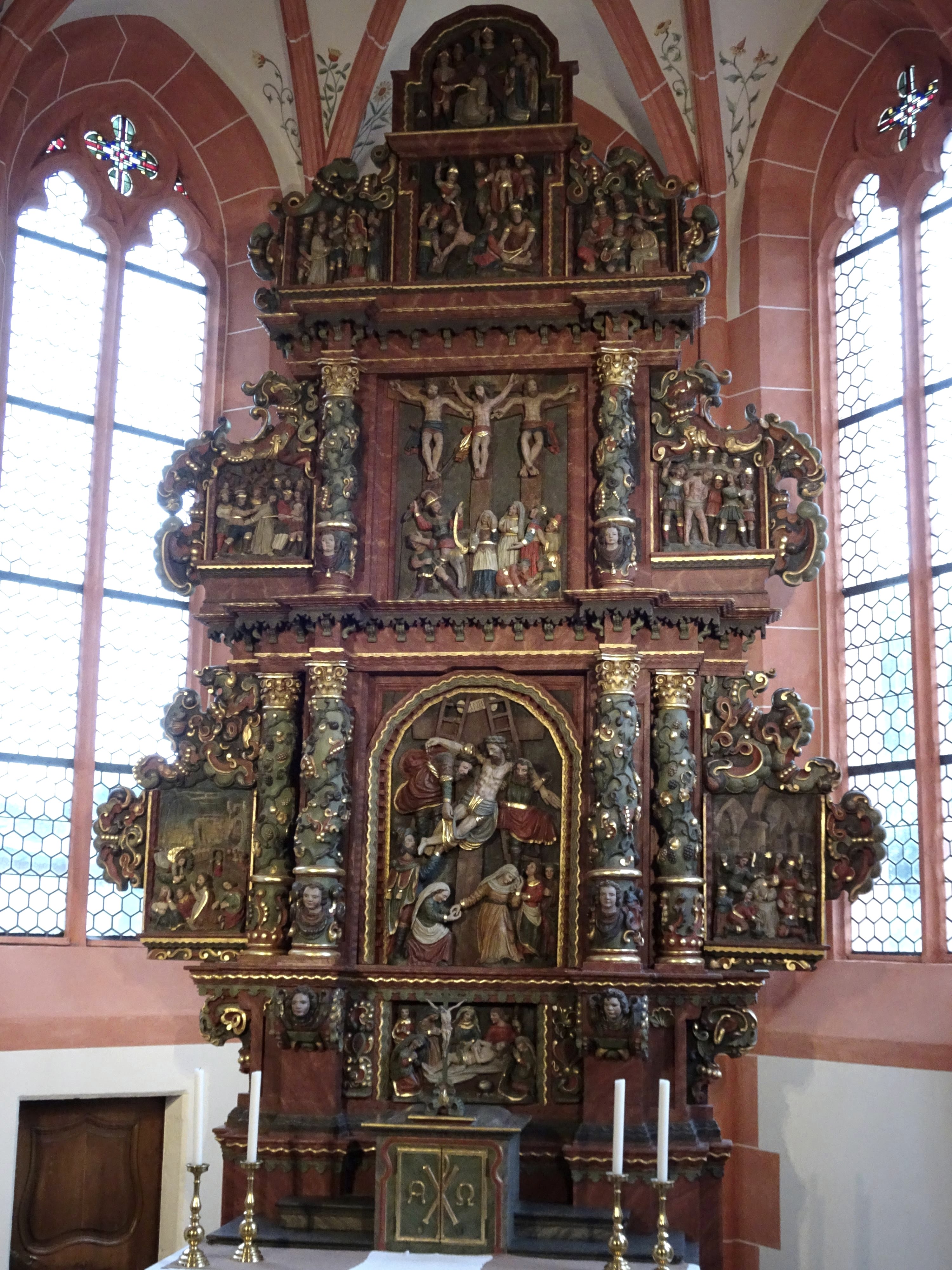 Today it is a protected cultural monument and well worth a visit. Not just because of the three-tiered Bitter-Leidens altar, errected in 1672, was carved by a farmer and carpenter named Bartholomäus Hammes originating from the neighboring town of Alflen over a period of 30 years. The baroque altar is one of the most impressive and beautiful in the Rhineland.