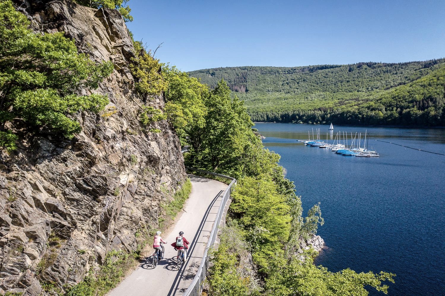 Cycling around the lake over 27 kilometres through the unique landscape, and with the lapping water always at your side. The tour can be extended to 42 kilometres, if one includes the lakes of Obersee and Urftsee. Naturally the trip would be much easier on a Pedelec. These can be hired by the lake. Small tip: best to call ahead and reserve one.