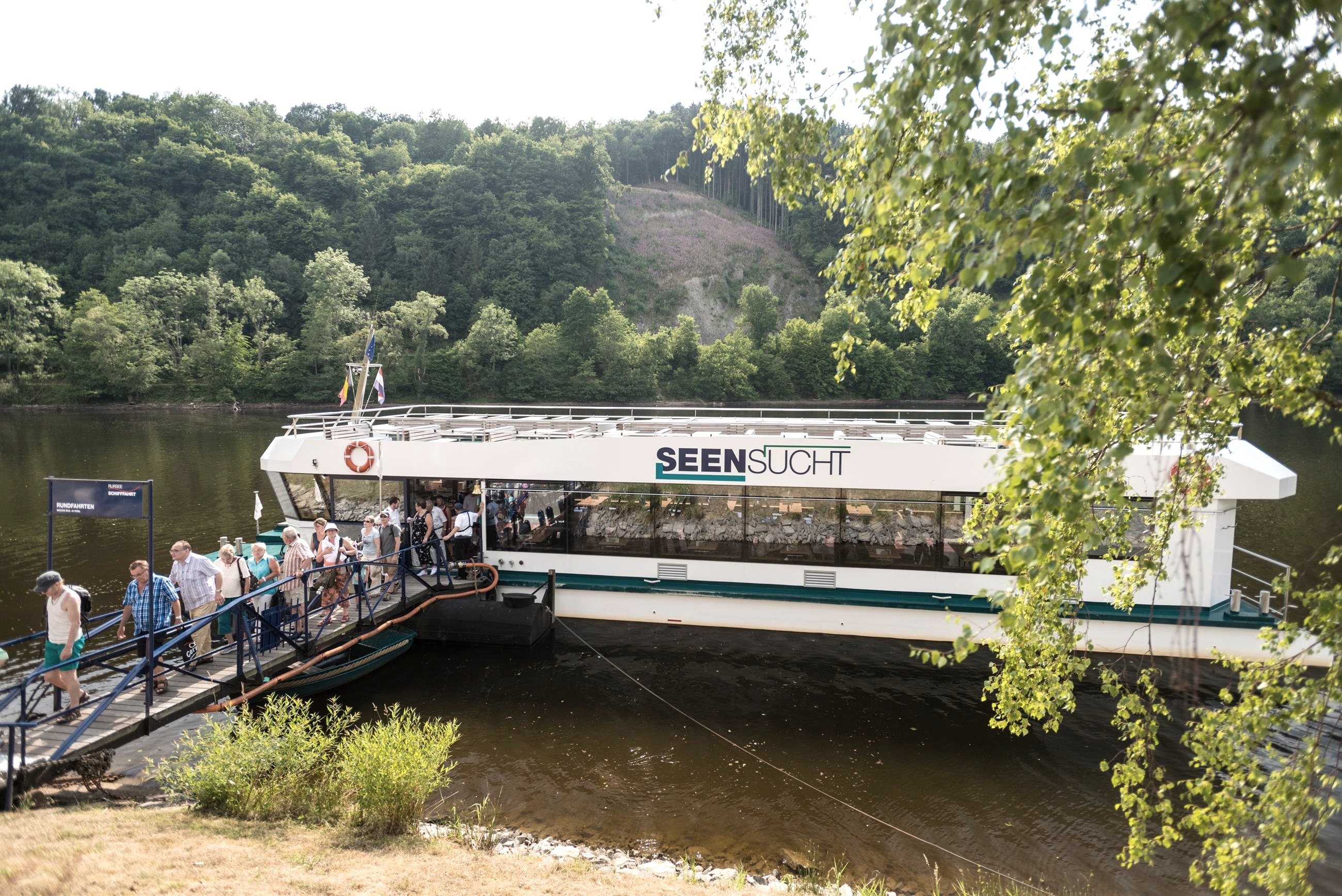 The noiseless electric ships "St. Nikolaus" and "Seensucht" operate on the Obersee. The quiet gliding over the Obersee and through the surrounding Eifel National Park is unique and can be experienced during a tour to the “Urftstaumauer”, to Rurberg or to Einruhr.