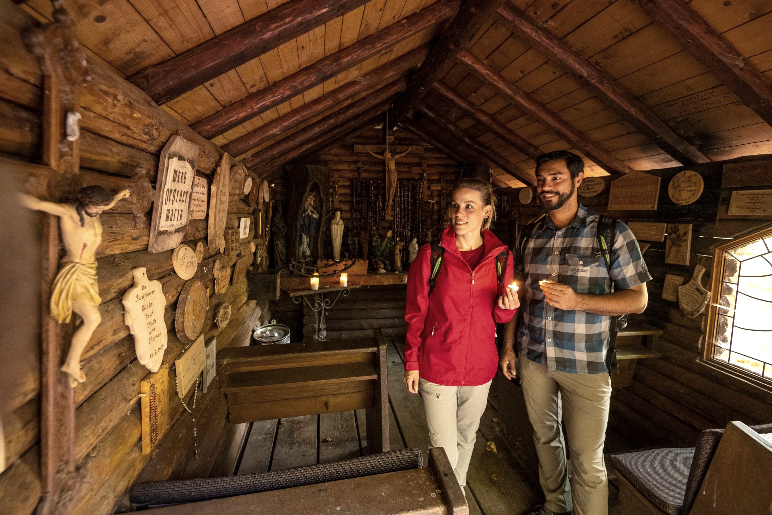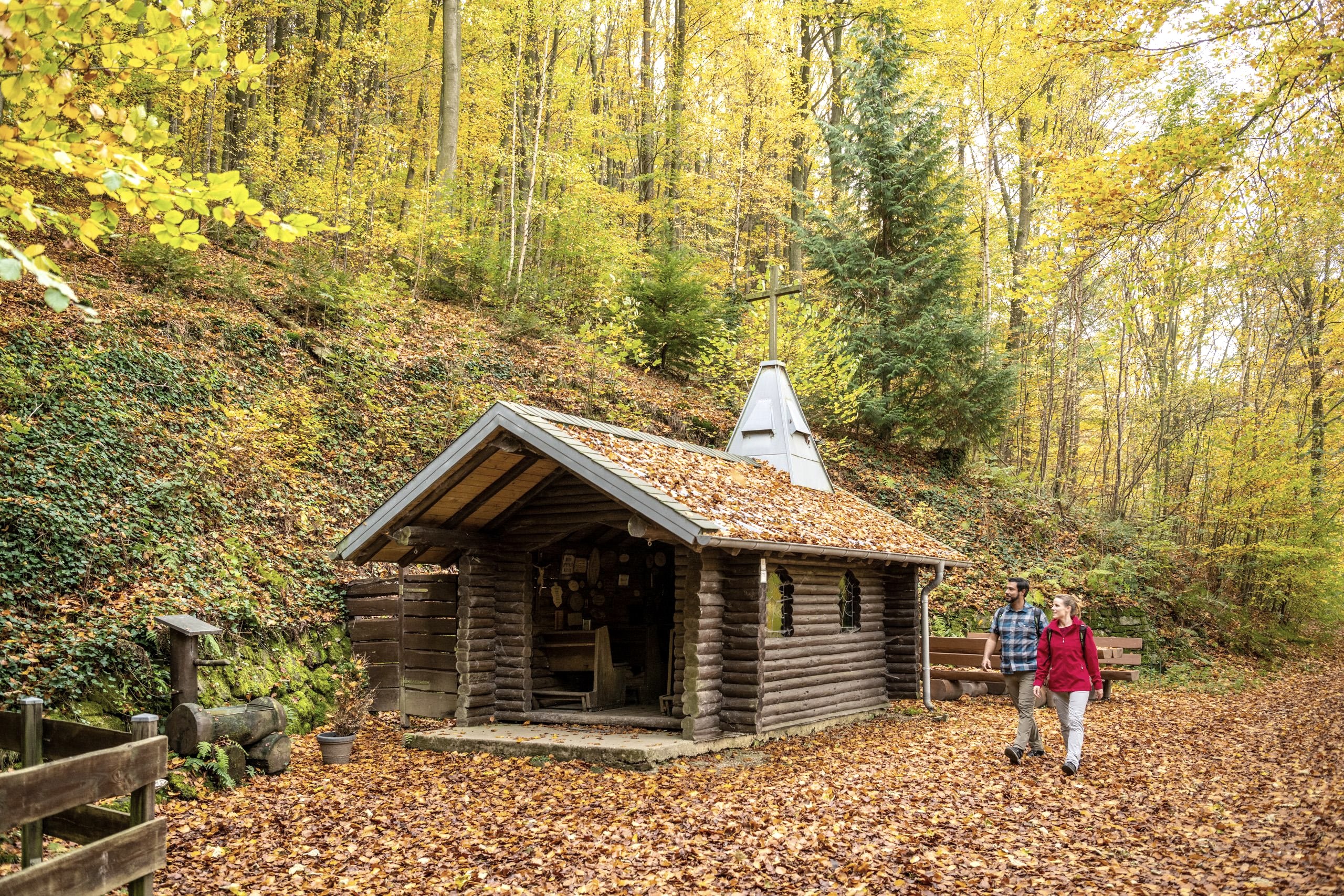 Located in the forest above Erkensruhr, the idyllic little chapel stands in the forest. It is a beautiful place that Ottmar Wollgarten and his colleagues chose in the early 1980s for the construction of the little church. Water trickles softly into a wooden fountain. As the numerous votive tablets show, people keep coming here to ask the Mother of God for help and intercession.