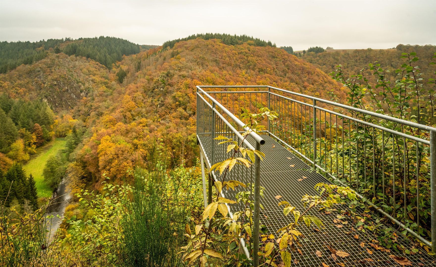 The viewing platform on the Burgberg near Karl leigt high above the Lieser Valley opens up a wide view of the Eifel landscape. Perfect for a cozy hiking rest is also the neighboring hut with its wooden benches.