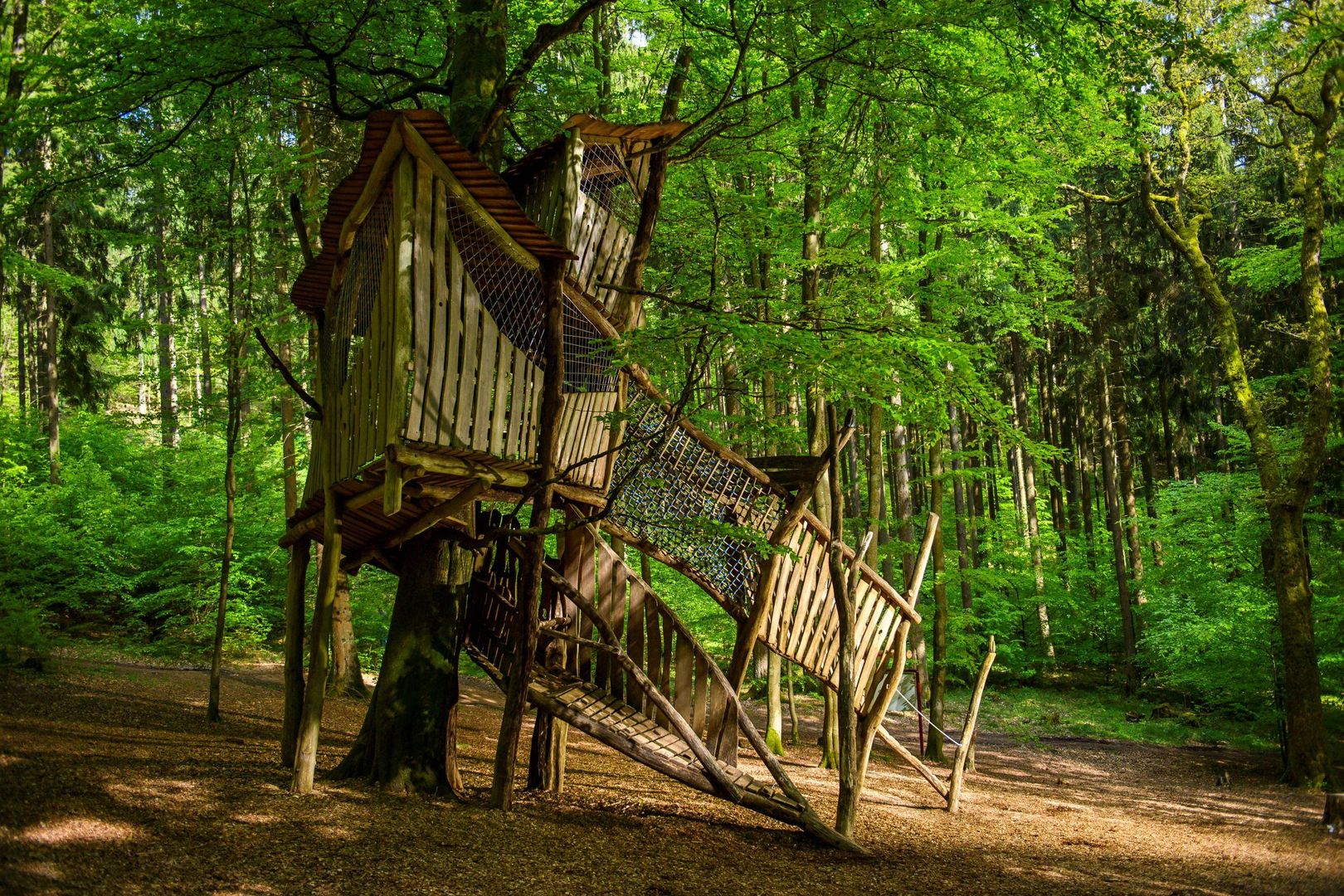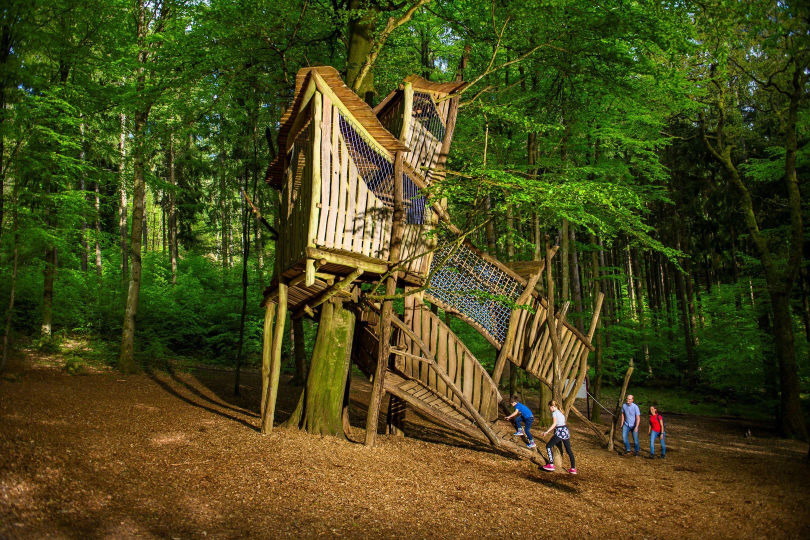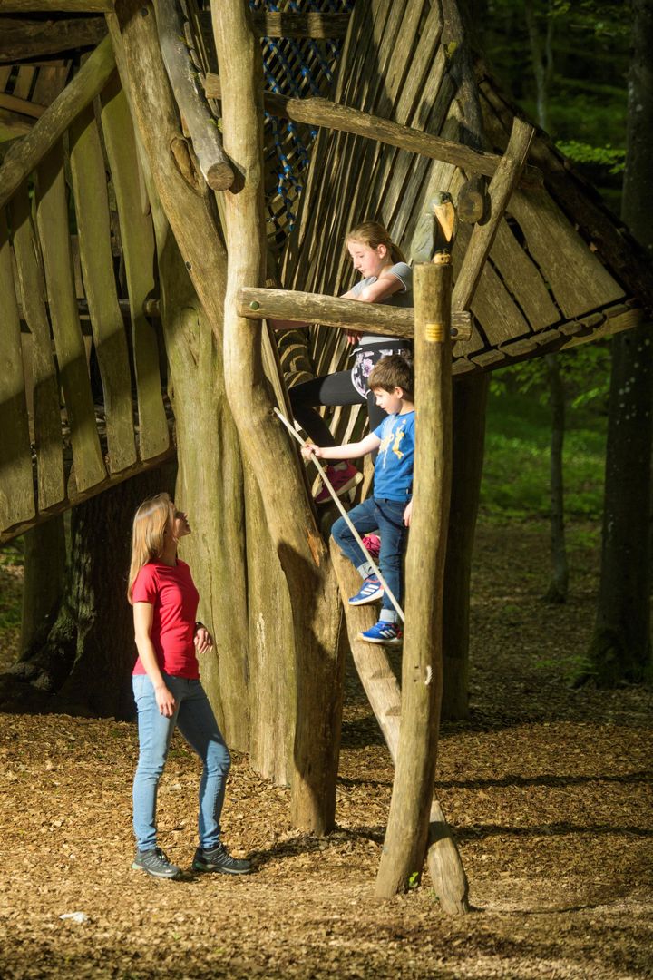 The tree house offers enough space for playing and observing nature on three platforms in 2,4 and 6 meters height. A ramp and a net tunnel lead to the tree house.