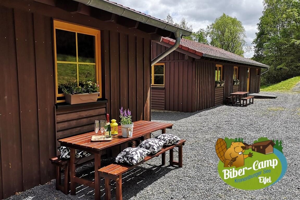 The Beaver-Camp at the lake of Kronenburg (Kronenburger See), surrounded by wooded areas and only 50 meters away from the lake, offers ideal conditions for a great family and group holiday. In five ecologically created bungalows each accommodates up to 8 people. The wooden cabins are all equipped with kitchen, living area, bath, shower and toilet. There is enough space (for up to 60 people) for community activities in the community house and on the large terrace with barbecue and comfortable seating area. Within walking distance there is a lakeside terrace with many attractive water sports and recreational opportunities, as well as other sports activities such as mini golf, tennis and volleyball right on the dam wall.