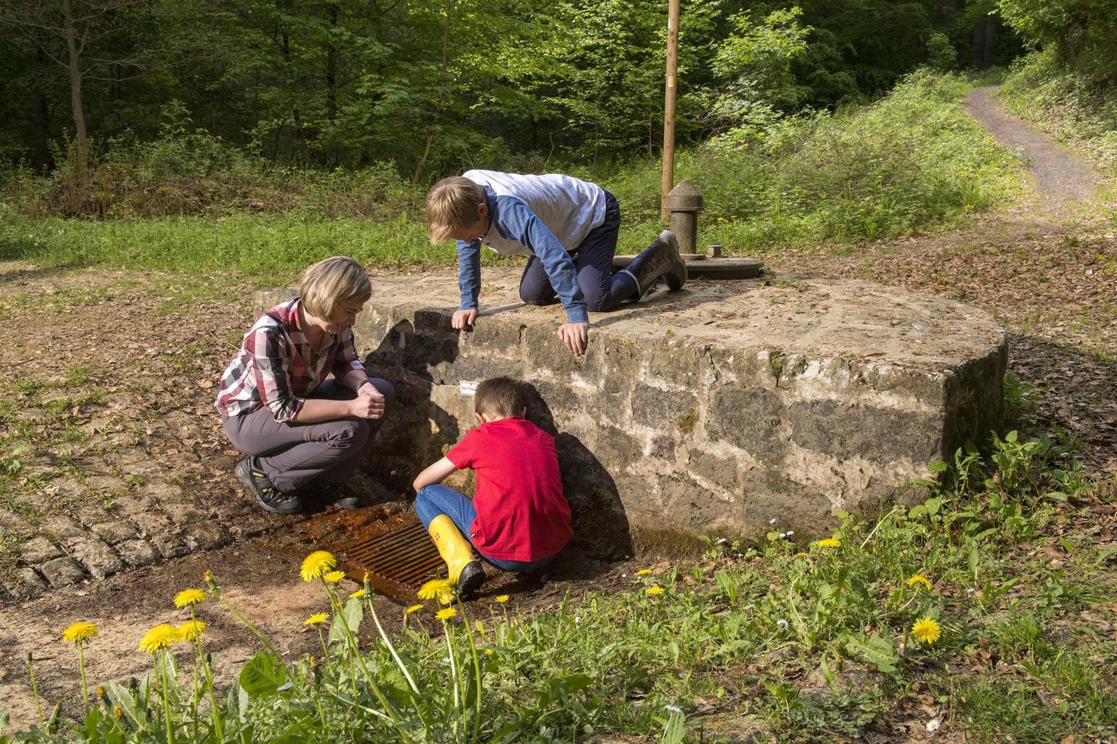 The sodium-alkaline-hydrogen carbonate "Säuerling" (acidulous water) from the forest area along the Erft-Lieser-Mosel hiking trail leaves rust-red deposits on the brick surround of the Dockweiler "Drees". The water bubbles out of the walled spring at a temperature of approx. 8° C.