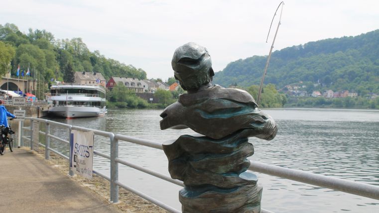 We treat ourselves to a quick selfie in front of the huge mosaic, which depicts a sundial with the watercourses and cantons of Luxembourg, and stroll on past the landing stages for boats and ships and the ferry terminal to the original sculptures of the fisherman.