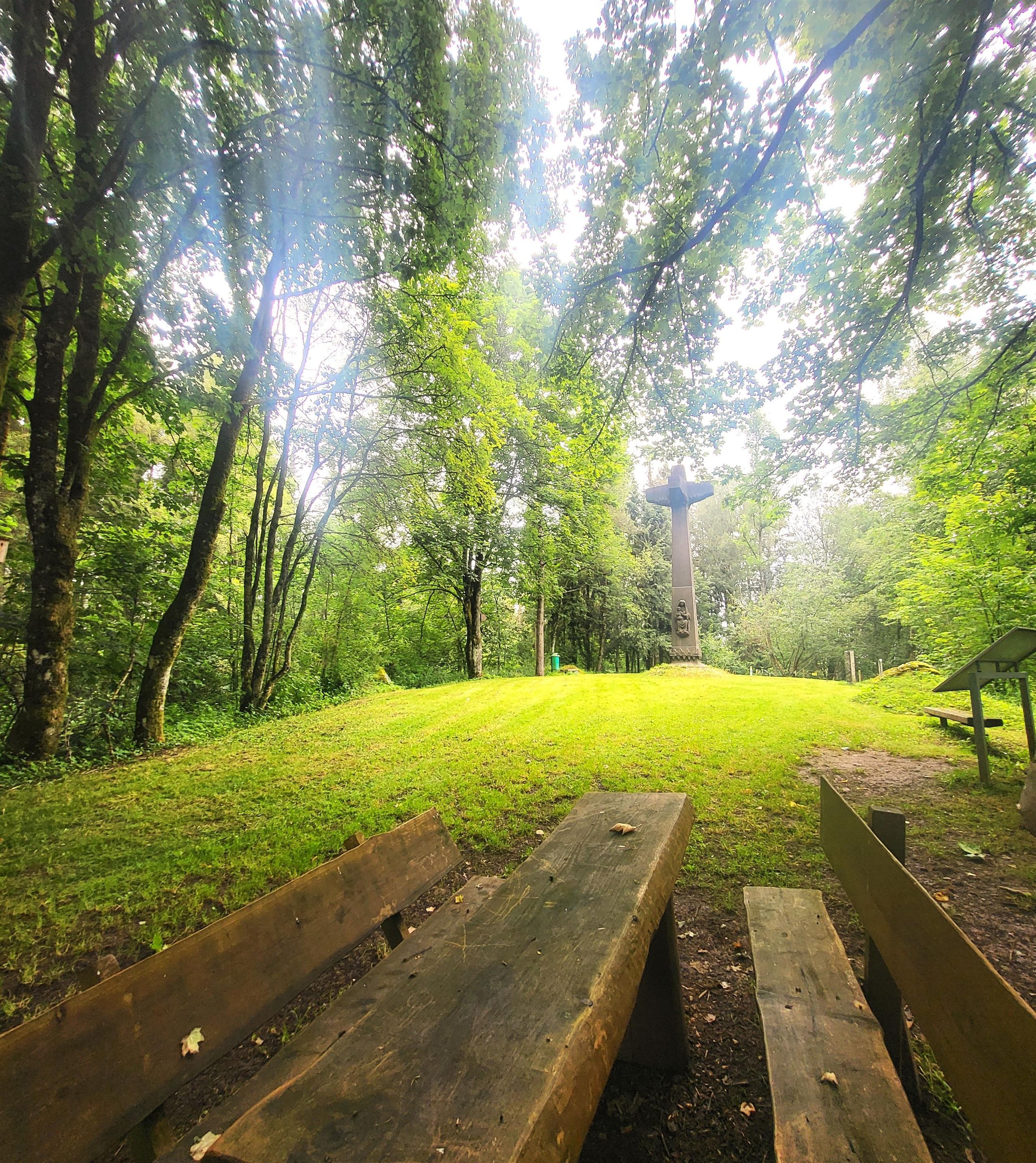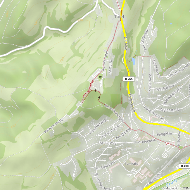 There was an ammunition depot in the tunnel system of this mountain. 30 percent of the city of Prüm was destroyed on July 15, 1949, when a fire broke out and the depot exploded - 500 tons of explosives, once deposited to blow up the West Wall fortifications, tore a crater 190 meters long and 90 meters wide into the mountain. At that time there were 12 dead, 60 injured, 76 destroyed and 161 damaged houses. July 15, 1949 is still called "Black Friday" by the people of Prüm today. The explosion crater, which is still visible today, is one of the largest man-made. A memorial cross on the Kalvarienberg commemorates the victims of the disaster. There are hiking trails, benches, a playground and information boards all around the Kalvarienberg. www.ferienregion-prüm.de