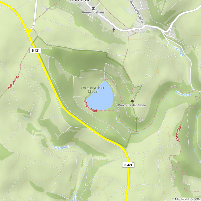 The maar blasted into the so-called ribbon slate tier! This is a transitional layer between the Lower Devonian Siegen- and Unterems tier. Here it is covered by maar tuffs at the surface. The maar cone was formed in an Üßbach tributary valley and originally had a size of 600 x 700 m with a depth of 60 m at the Devon top edge. Particularities Just as several other maars in the Eifel (Meerfeld maar, Eichholz maar), the maar lake was drained in 1750 by deepening the stream ravine and used for agriculture. The maar soil was significantly more fertile than the surrounding rocky slate soil lacking minerals. During World War I, between 1914 and 1918, nobody maintained the drainage, allowing a shallow maar lake to form again until today! The maar lake now only has one drainage, but no inlet! Water is only added by rainfall, surface and groundwater!