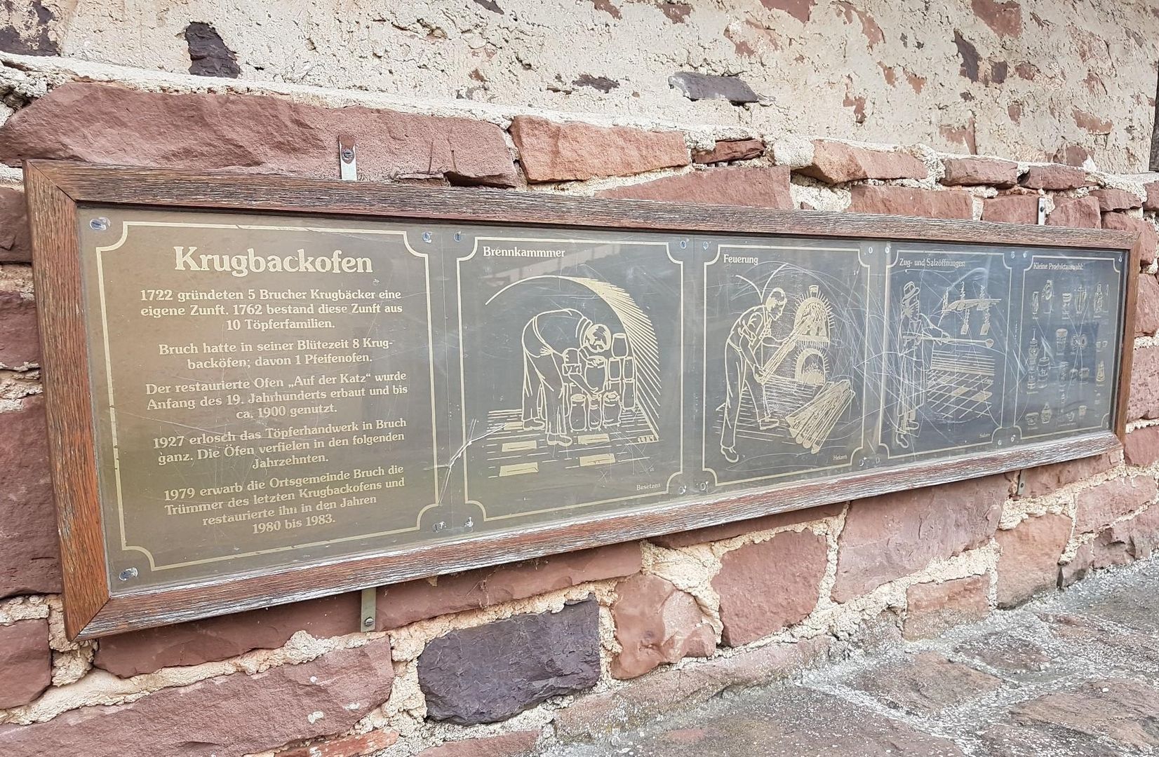 In 1722 5 Brucher jug bakers founded their own guild. In 1762 this guild consisted of 10 potter families. In its heyday, Bruch had a total of 8 jug baking ovens, one of which was a pipe oven. In 1927 the last pottery workshop in Bruch was closed and the kilns decayed in the following decades. Only the kiln "Auf der Katz" was acquired by the local community of Bruch in 1979. From 1980 to 1983 the still existing rubble was restored to the still impressive cultural monument.