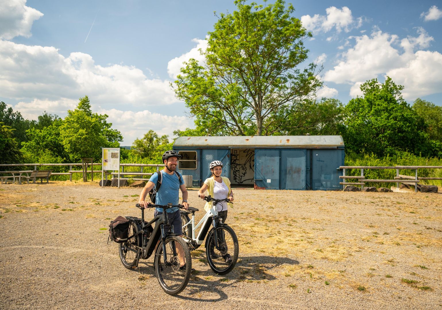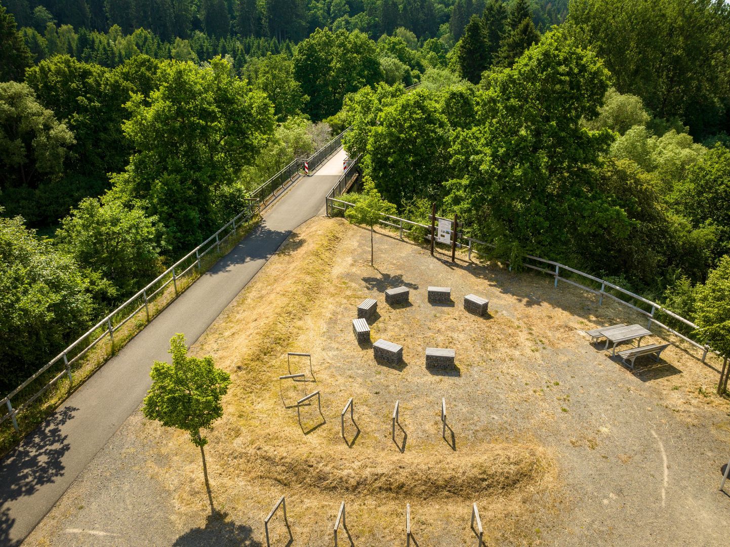 The beautifully designed rest area on the Kyll cycle path near Stadtkyll invites every cyclist to linger. You can relax either on one of the ergonomic benches or on the various other seats. If it rains, there is the option of sheltering in an old railway carriage. There are also tables and benches in the wagon.