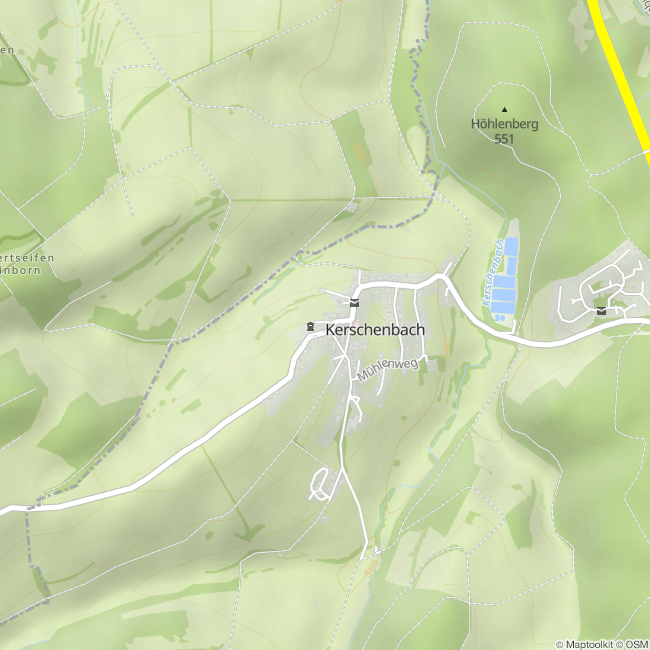 The chapel in Kerschenbach is dedicated to St. Luzia. The construction began in the 14th century. The first documentary mention of a chapel in Kerschenbach dates back to 1657, when the hospitalin Prüm donated a sack of grain for repair. After major repairs in 1811, the chapel received new altars in 1866. The plastered quarry stone building is attributed to late gothic.