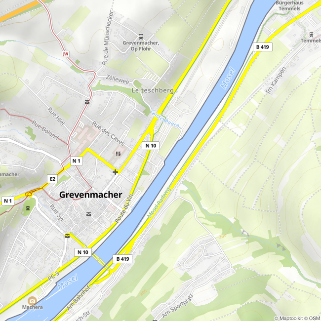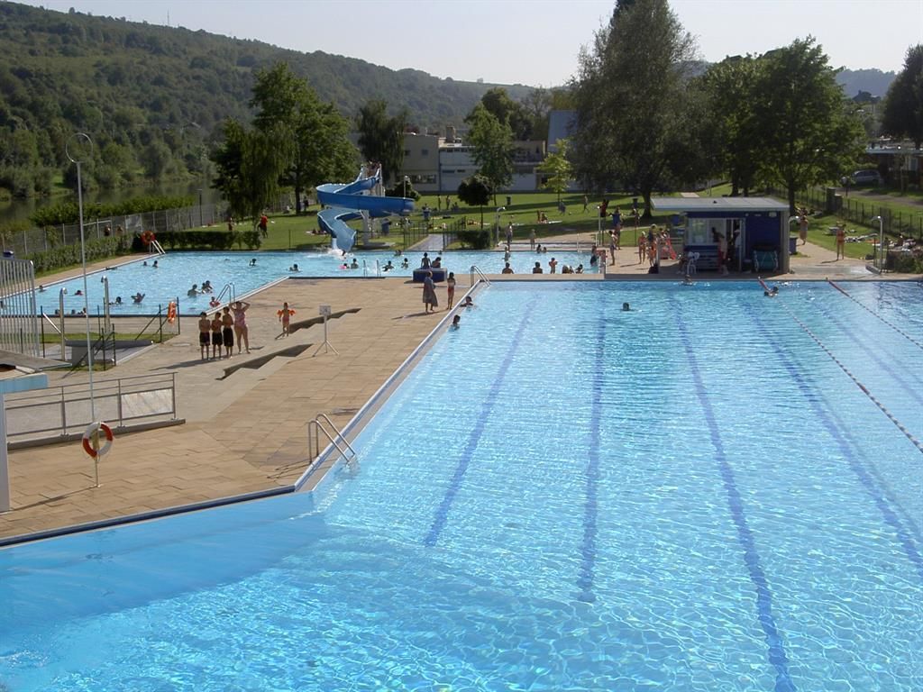 Heated open-air swimming pool directly on the Moselle with a sunbathing area of 4500m², sun terrace with deckchairs, a food kiosk, a swimming pool 50x16m, a non-swimmer pool, a children's paddling pool and a slide.