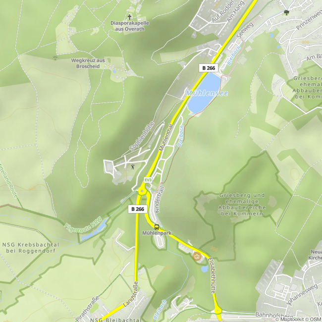 Sporting fun is guaranteed on the high-quality asphalt surface of the pump track in the Kommern generations and recreation park Mühlenthal in almost any weather. It was opened in 2021. Bicycles of all kinds can be used on it - such as mountain bikes, BMX bikes, or dirt bikes, as well as scooters, skateboards, inline skates, and balance bikes. The track is designed like an eight and can be ridden in both directions. It offers "Bumps" (single hills), "Doubles" (jumps with two waves), "Triples" (jumps with three waves), and steep curves. Jumps of up to about 1.5 meters in height are possible.
