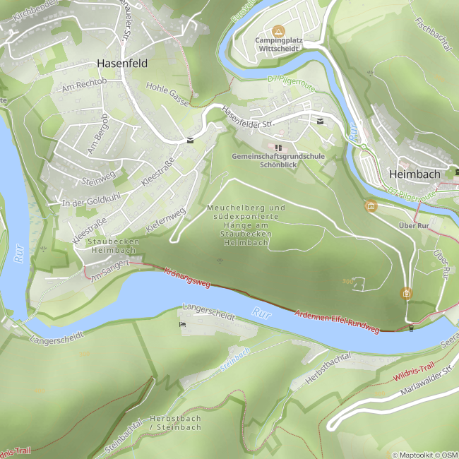 On the Meuchelberg in Heimbach there is a remarkable structure known as the Eifel Loop. This striking resting place consists of a curved bench with room for two people. Hikers can take a cosy seat here during a hike, sit opposite each other and take a well-earned break.