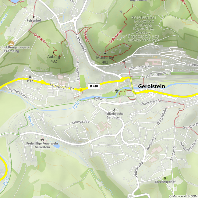 In 1723, the water of the Sidinger Dreis was praised because it “removes the constipation of the liver, bile and intestines, and strengthens the stomach and all intestines”. Promptly Count Franz Georg von Manderscheid-Blankenheim had the spring recaptured and the “highly acclaimed” water in jugs filled with his coat of arms. Through his Cologne branch he distributed the water as far as Holland. The Sidinger Drees is rightly regarded as the source of the local mineral water industry. The Sidinger Drees fell into the possession of the town of Gerolstein in 1890, but was now finally dried up. Several attempts were made later to find and grasp the source, but in vain. Today, a pavement with fountains, modelled on the Roman model, adorns the former Sidinger Drees. When stopping on site, you should be aware that the most important geological and geographical units of the Gerolstein Land are covered here in a very small space: Dolomites and limestone of the Middle Devon, Early Quaternary Eifel basalt, Gerolstein mineral water and the young breakthrough valley of the Kyll.