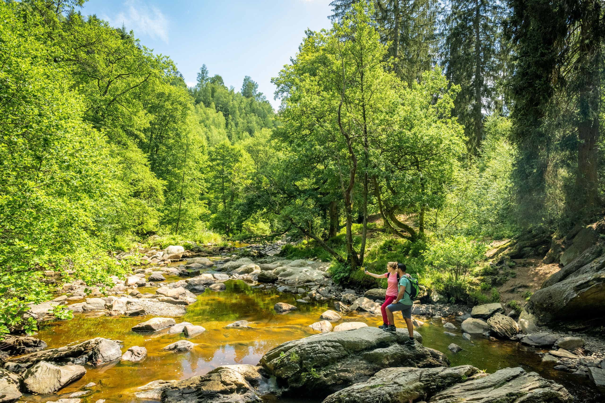 Rushing waters, bright blossoms, fields of grazing cattle and incredible views – the "Klosterroute" around the textile-manufacturing town of Monschau is the perfect way to spend a day in nature. Landmarks like the mighty Engelsley and Teufelsley rocks, the wild and romantic Rur valley, the meadows around Kalterherberg and the Perlenbach valley dot the trail. A vast array of flora and fauna – unparalleled elsewhere in Germany – adds a special touch.