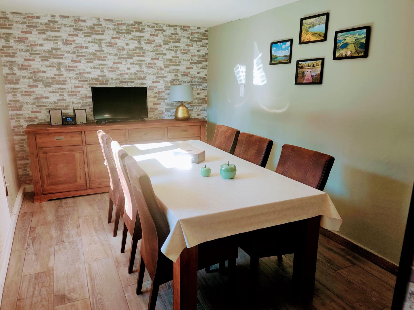 the house has 3 bedrooms, of which 2 rooms with box spring and 1 bedroom with bunk beds. upstairs living room with tv and salteliet tv and netflix. bathroom with shower and toilet. kitchen with refrigerator with freezer, microwave, airfryer, oven, grill dishwasher. dining place with games and all information from the region. infrared sauna, terrace with all furniture and grill.