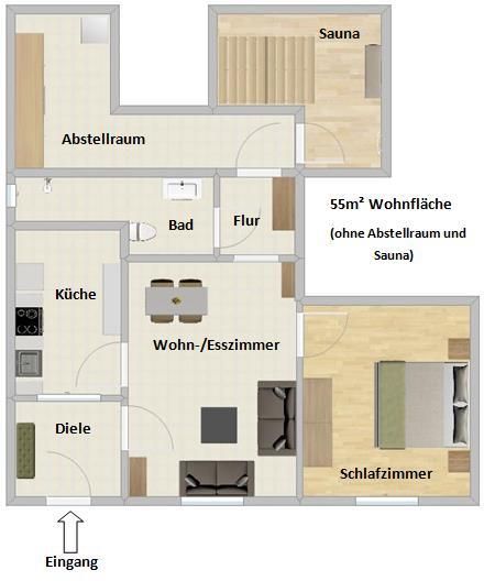Your holiday flat has a light foyer, a cozy living room with a couch and a dining corner, a separate fully-equipped kitchen, a roomy bedroom with a full-size bed and a bathroom with a shower.