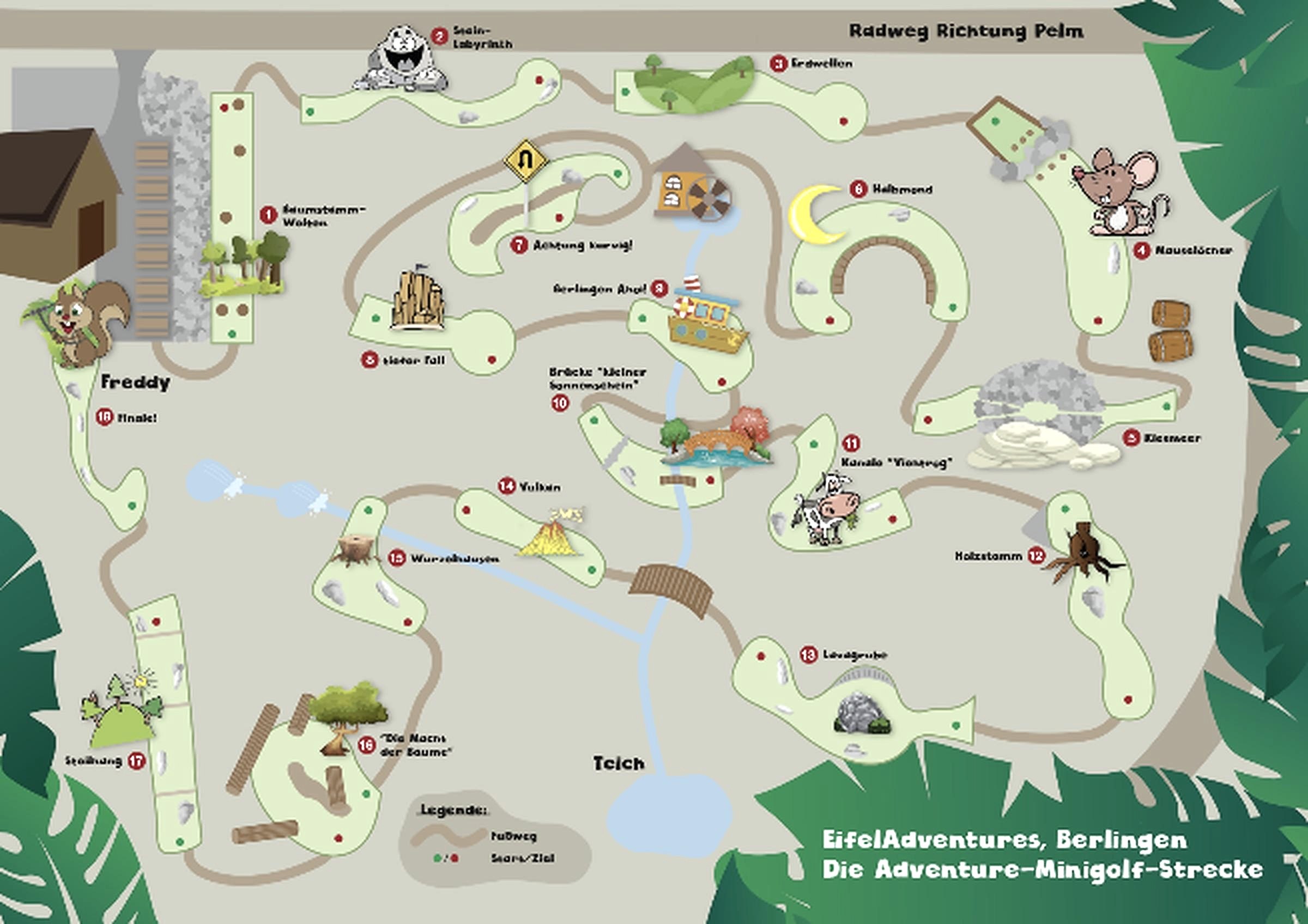 L'ensemble du complexe Adventure-Minigolf d'EifelAdventures à Berlingen est amoureusement intégré dans la nature. Sur un total de 2.500 m², 18 pistes sont situées dans un cadre magnifique. Les obstacles sont principalement constitués par des matériaux naturels tels que des troncs d'arbres, des pierres, des racines et des collines. Les pistes sont faites de gazon artificiel. Les obstacles sont principalement constitués par des matériaux naturels tels que des troncs d'arbres, des pierres ou des collines. Seuls ceux qui parviennent à déjouer les troncs d'arbres, à trouver le bon trou de souris ou à traverser le ventre, apprennent à quel point il est agréable d'être un vrai mini-golf d'aventure. De plus, chez EifelAdventures à Berlingen, il est possible de participer au parcours de minigolf aventure 18 trous une fois par mois dans l'obscurité de la nuit, à la lumière de la pleine lune. Chaque invité reçoit une lampe frontale et peut profiter d'un événement de minigolf nocturne très spécial avec des boules lumineuses pendant que le soleil se couche et que les étoiles s'élèvent dans le ciel. Expérience PUR pour petits et grands!