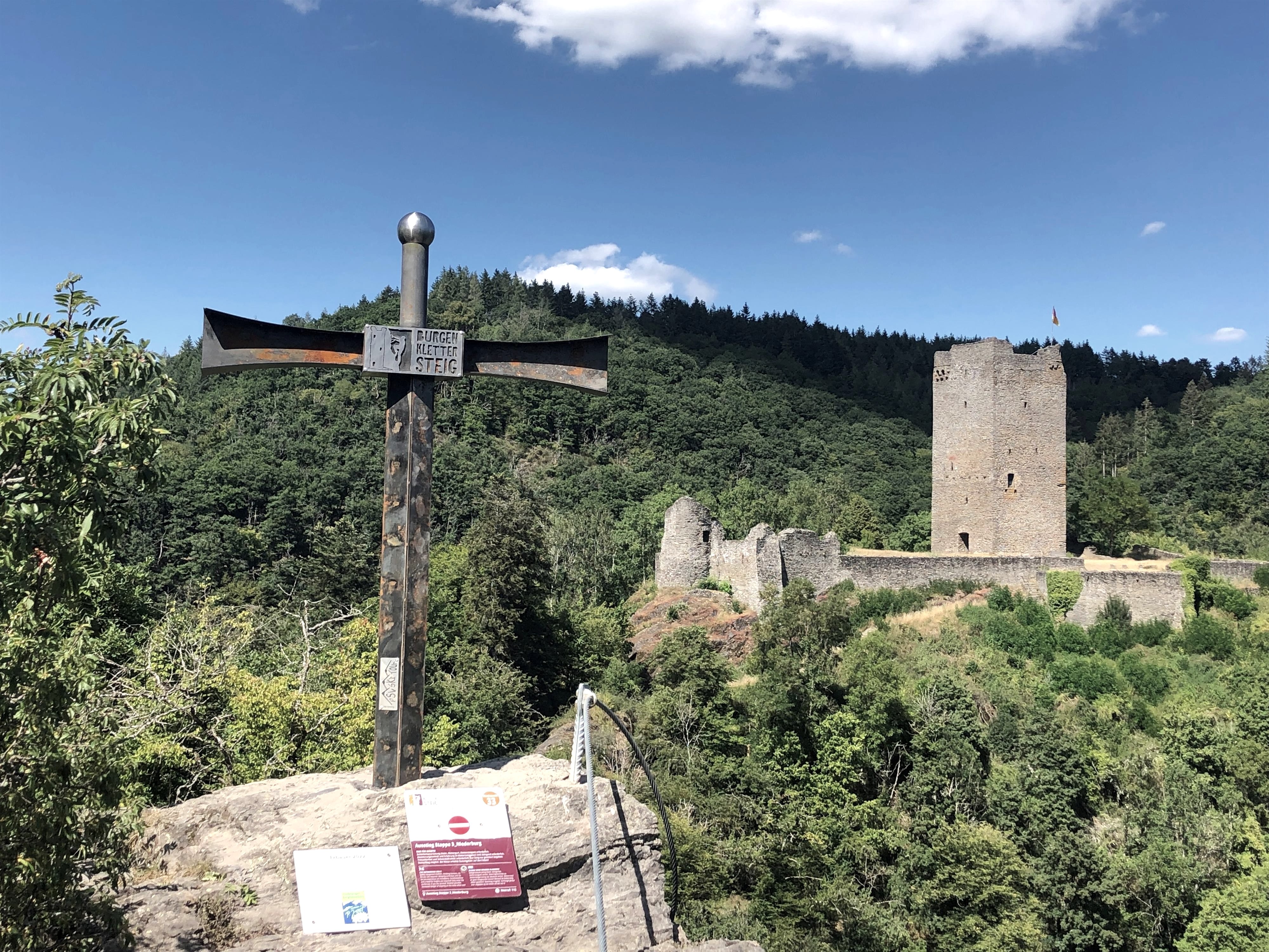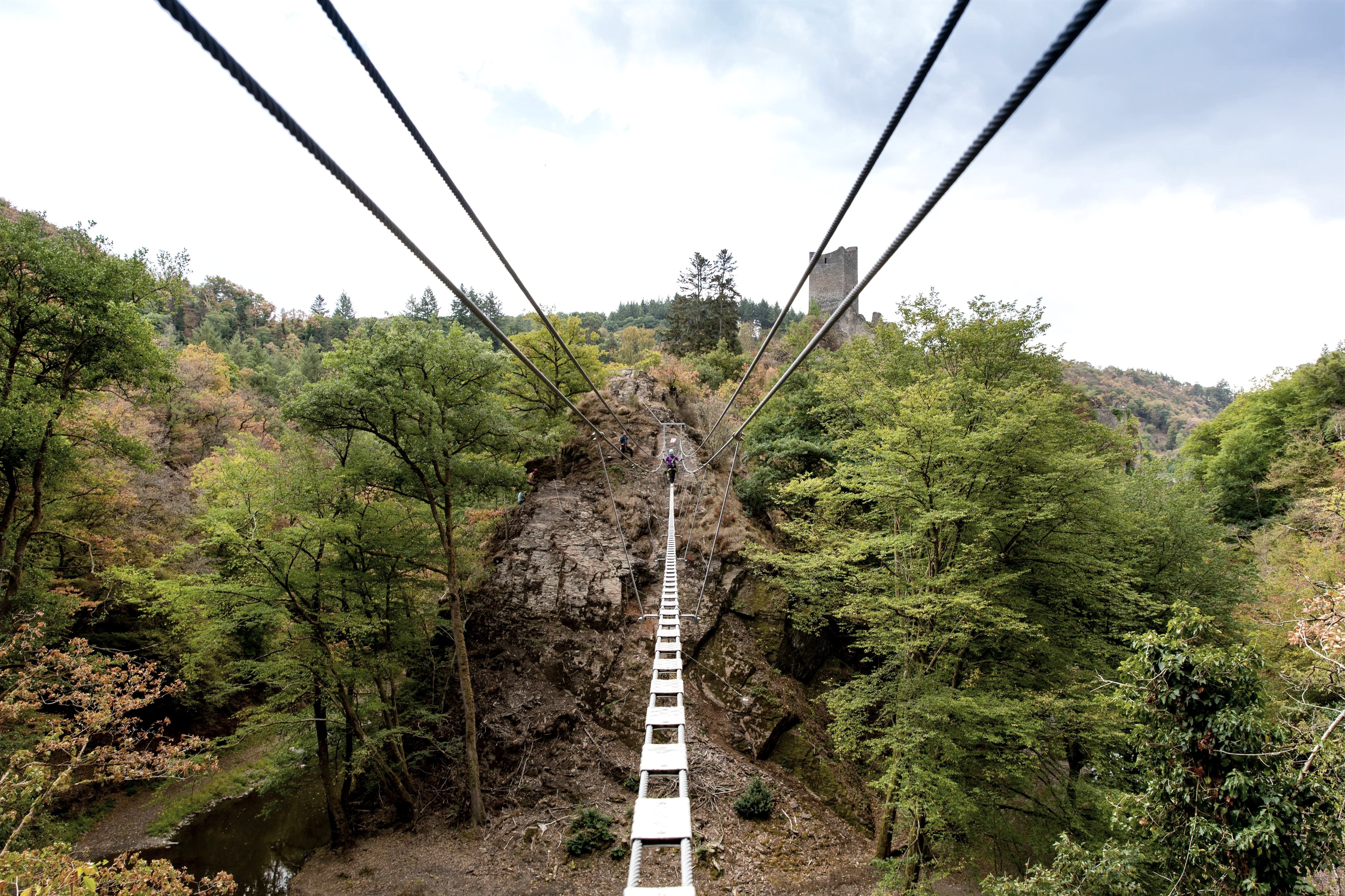 "La via ferrata du château de Manderscheid - disons-le tout de suite - est la meilleure via ferrata non alpine d'Allemagne ! La ferrata a tout ce qu'il faut pour être vraiment une bonne via ferrata - des paysages superbes (une belle ville, la plupart du temps au bord d'un ruisseau, l'Eifel volcanique à l'état pur), des points forts historiques (le château supérieur et le château inférieur et les anciens sentiers des chevaliers) et bien sûr des passages de via ferrata superbes, parfois même assez ardus. Dans cette ferrata, on traverse en premier lieu le long des rochers, il y a bien sûr aussi des passages verticaux raides - la clé du succès est souvent un peu difficile, il faut chercher à gauche et à droite de bonnes prises pour les pieds. Il est certain qu'après avoir accompli une assez longue via ferrata, la sueur coule un peu du front ou même que les genoux tremblent un peu sur le pont de 60 mètres du château fort, mais on éprouve un grand sentiment de bonheur à la fin, au "Kaisertempelchen", et on peut encore une fois profiter de la vue parfaite sur le paysage de l'Eifel et les deux châteaux forts".