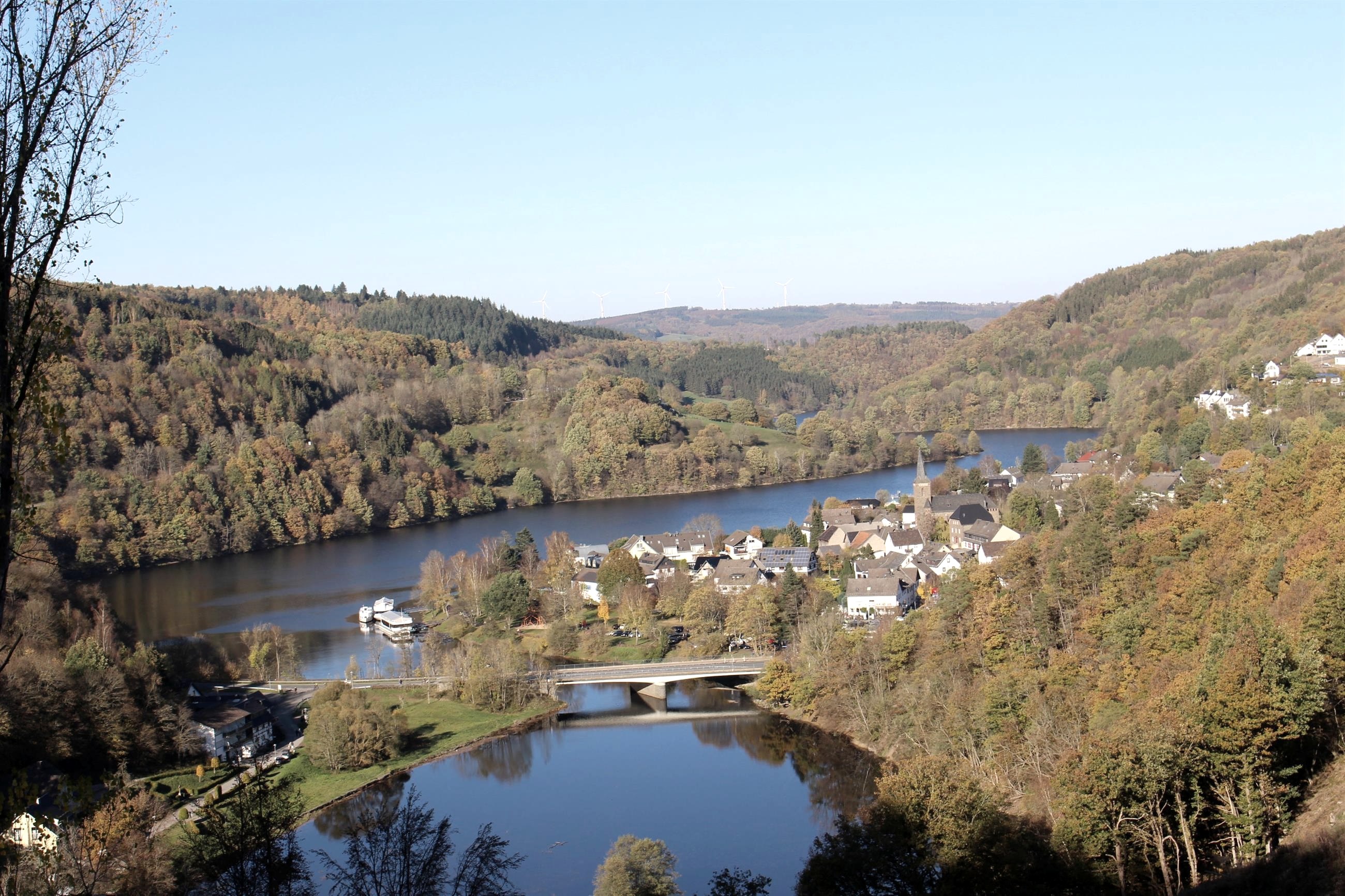 L'Eifel-Blick "Wolfshügel" se trouve à 360 m d'altitude, au-dessus d'Einruhr. Cette situation exposée permet d'avoir une vue fantastique sur ce petit village de l'Eifel qui vaut la peine d'être vu. Au-delà du village, la vue s'étend sur le lac supérieur jusqu'à la zone forestière de Buhlert. Le pont sur la Rur visible au premier plan a été construit au 19e siècle et fut le premier pont en pierre à traverser la Rur.