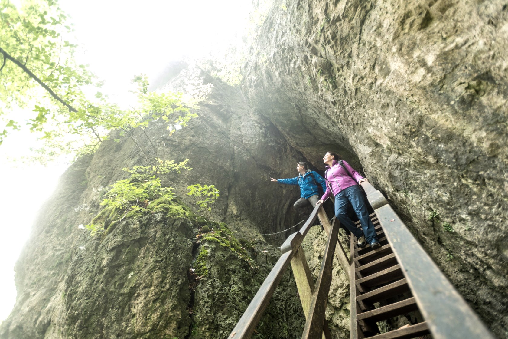 Au départ de ta randonnée dans la ville du polar de Hillesheim , tu te sentiras tout de suite un peu en hauteur, car tu te tiendras sur les remparts historiques de la ville de Hillesheim. De là, tu as une vue magnifique sur la ville et le paysage de l'Eifel. Peu de temps après, la petite vallée idyllique de Bolsdorf t'accueille avec son lac, ses rochers calcaires et le ruisseau de Hillesheim qui serpente à travers les prairies. Tu continues à marcher dans un paysage ouvert jusqu'à ce que tu traverses la rivière Kyll et que tu montes petit à petit. Ton regard s'arrête sur une rampe d'escalier dans la forêt clairsemée - où mène cet escalier ? Intrigué, tu descends les marches. Un souffle d'air froid s'engouffre dans ta direction et l'obscurité s'installe autour de toi. Tu te trouves dans l'une des grottes de meules près de Roth. Elles ont été formées par l'extraction de pierres à moudre au milieu du volcan Rother Kopf. Dans la forêt à l'extérieur de la grotte, tu peux même découvrir une meule de moulin non terminée. Arrivé au sommet, une vue sur l'intérieur du volcan s'étend sous tes pieds : Tu regardes dans une carrière de lave. Du Rother Kopf, tu as également une vue étendue sur les collines de l'Eifel, parfait pour une pause avant de continuer en légère descente vers le lac de barrage de Gerolstein. Tu résistes à la tentation de bifurquer dès ici vers la destination de l'étape, Gerolstein. C'est là que les choses deviennent vraiment intéressantes : après le paysage volcanique, ce sont maintenant les impressionnantes falaises des Dolomites de Gerolstein qui s'offrent à toi. Autrefois (il y a environ 390 millions d'années, au Dévonien inférieur), il y avait ici une mer chaude ! Aurais-tu imaginé cela ? Les dolomites sont un ancien récif corallien. Laisse simplement libre cours à ton imagination et tu le reconnaîtras.