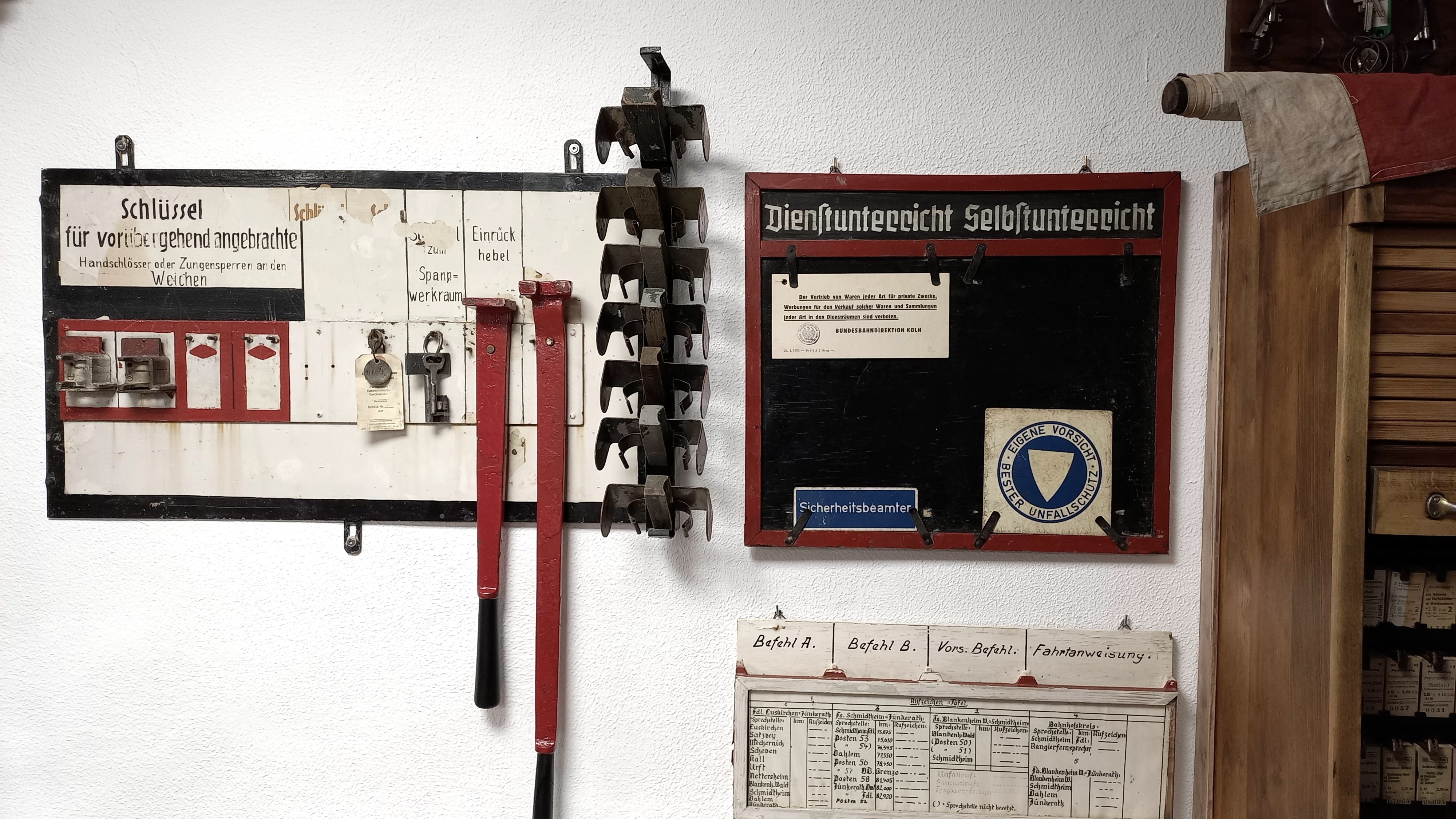 Il restait cependant beaucoup de choses qui faisaient autrefois le travail de cheminot dans la région de l'Eifel et de la Moselle. Uniformes, lampes, téléphones, tampons, panneaux, pinces à billets, outils et autres pièces d'équipement. A cela s'ajoutaient des règlements de service, des horaires, des tableaux de service, des feuilles de route, des billets et de nombreux autres documents. Pendant de nombreuses années, les amis des chemins de fer de Jünkerath ont collecté tout cela, l'ont remis en état, l'ont entretenu et l'ont exposé dans un musée.