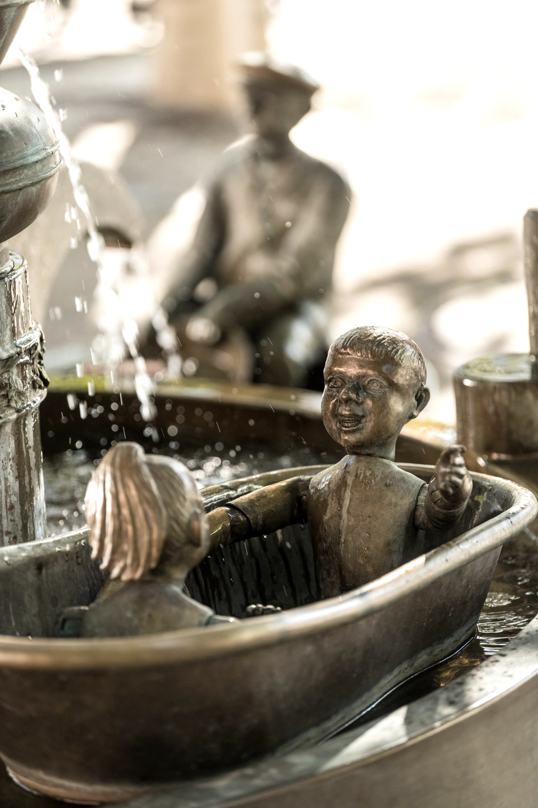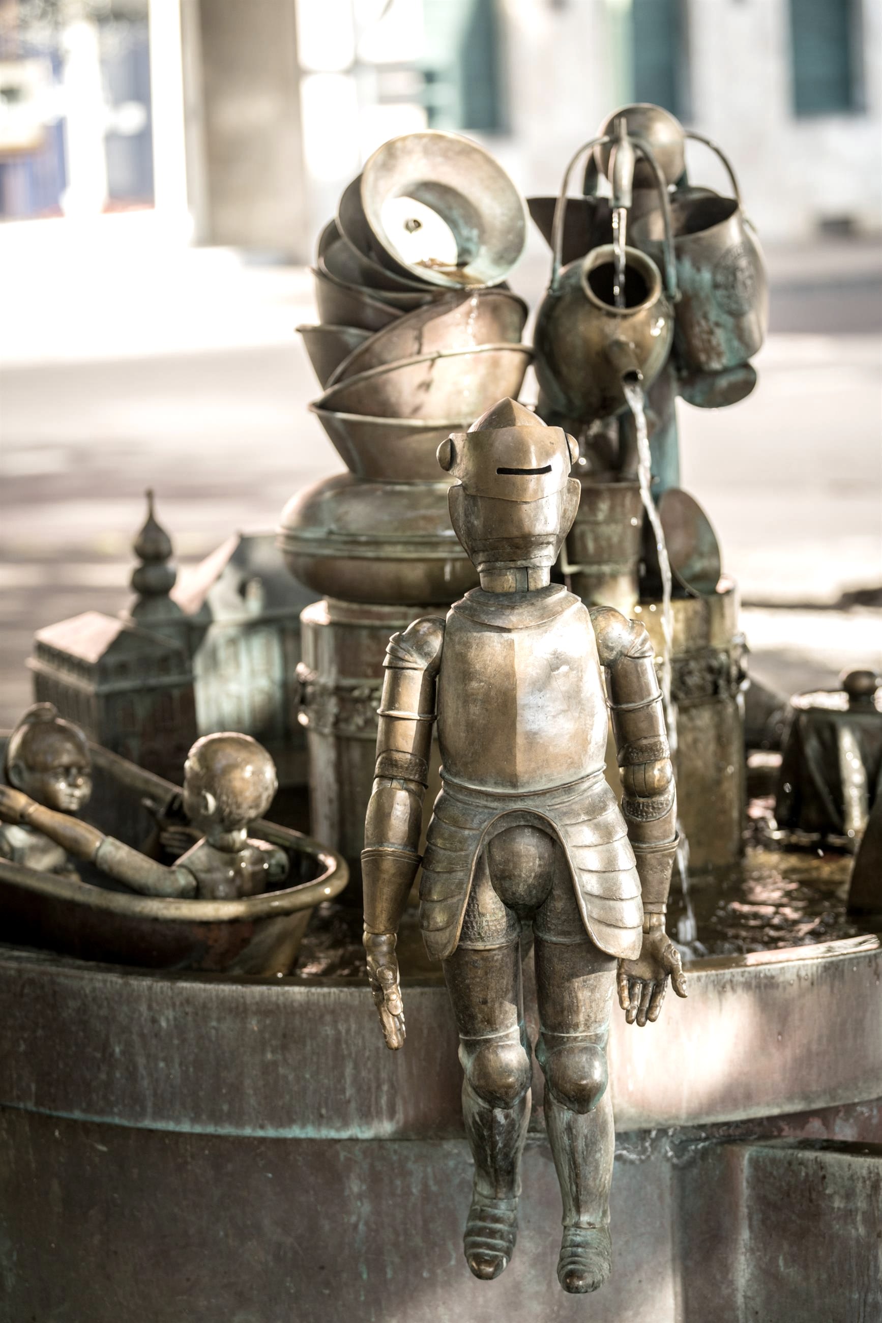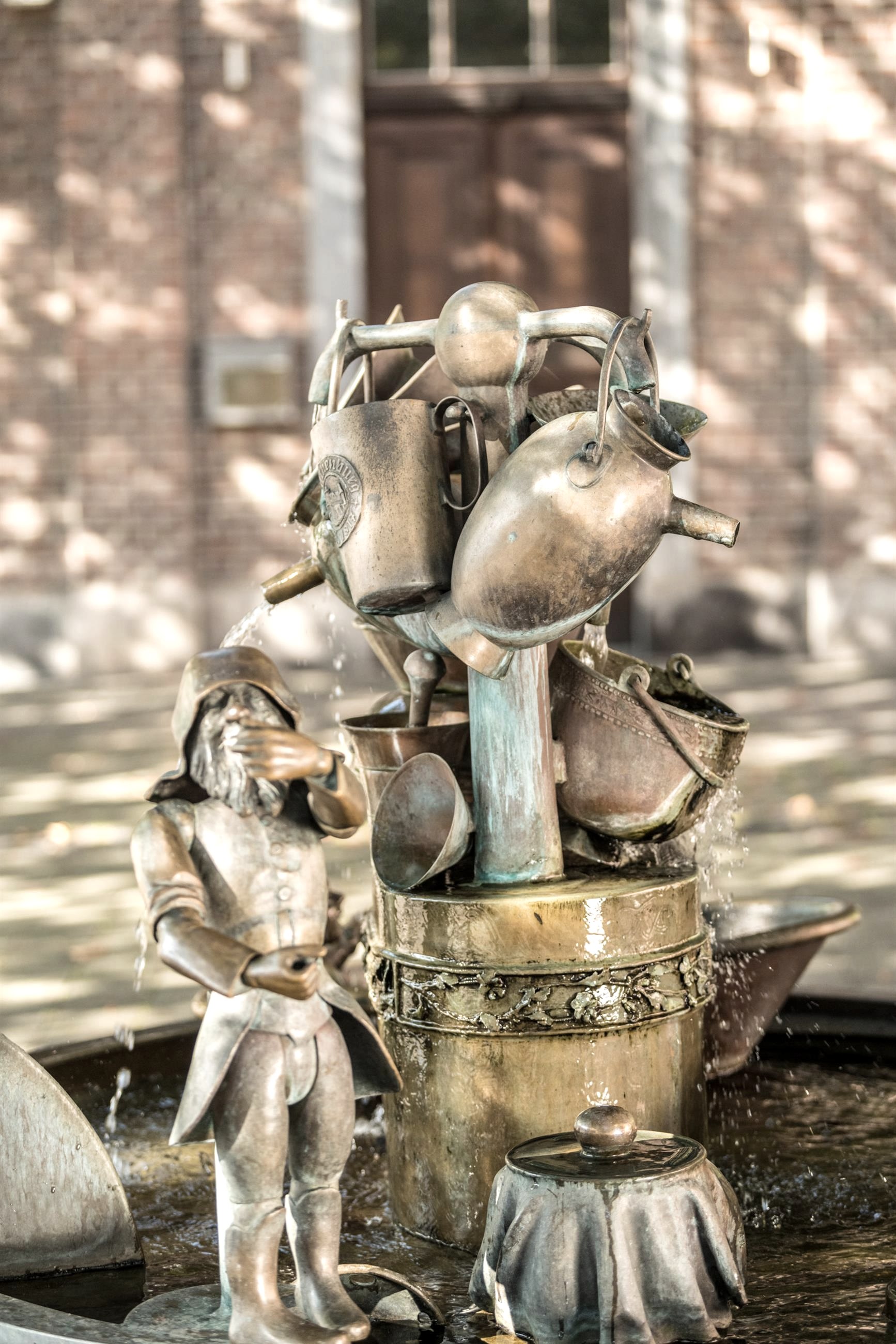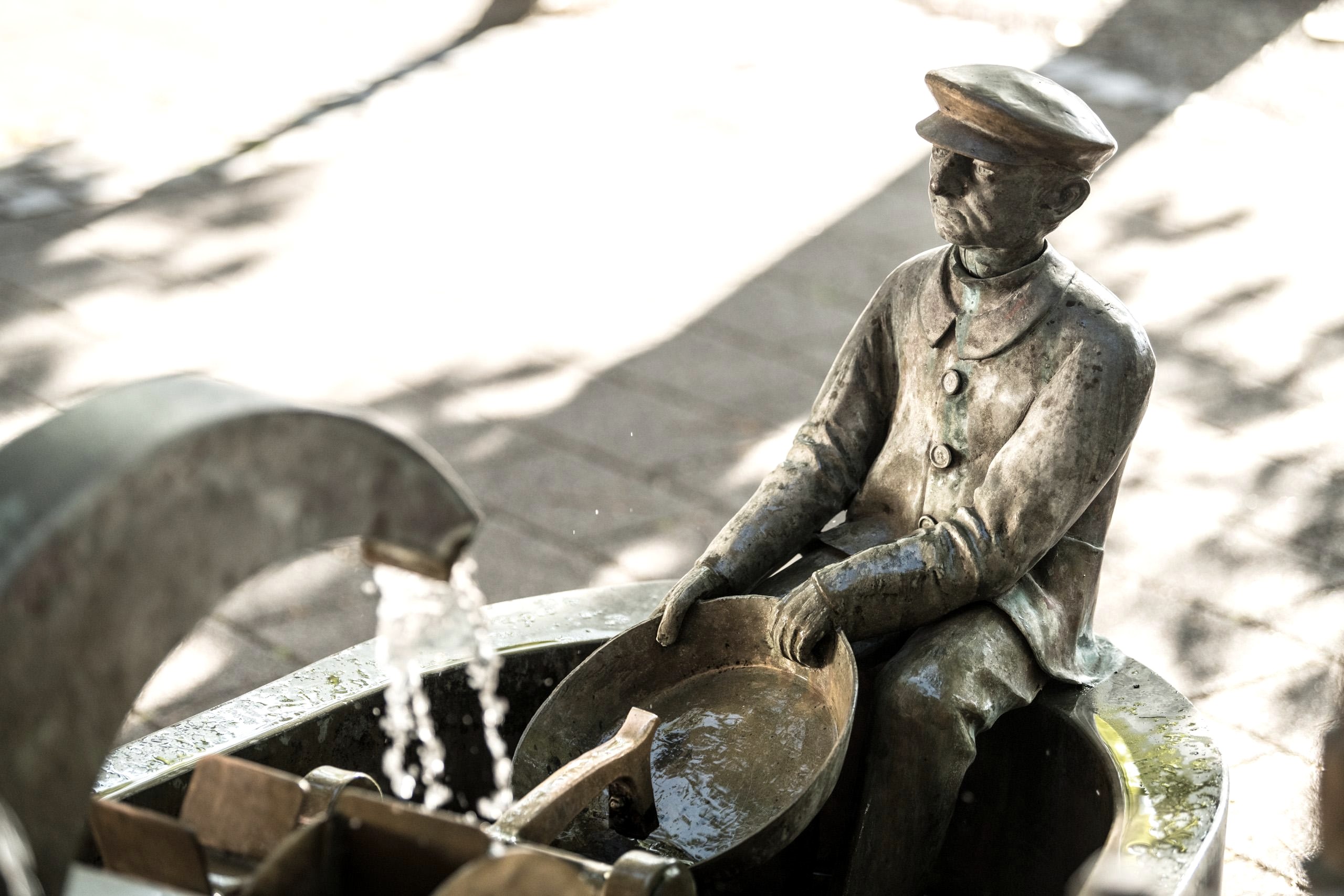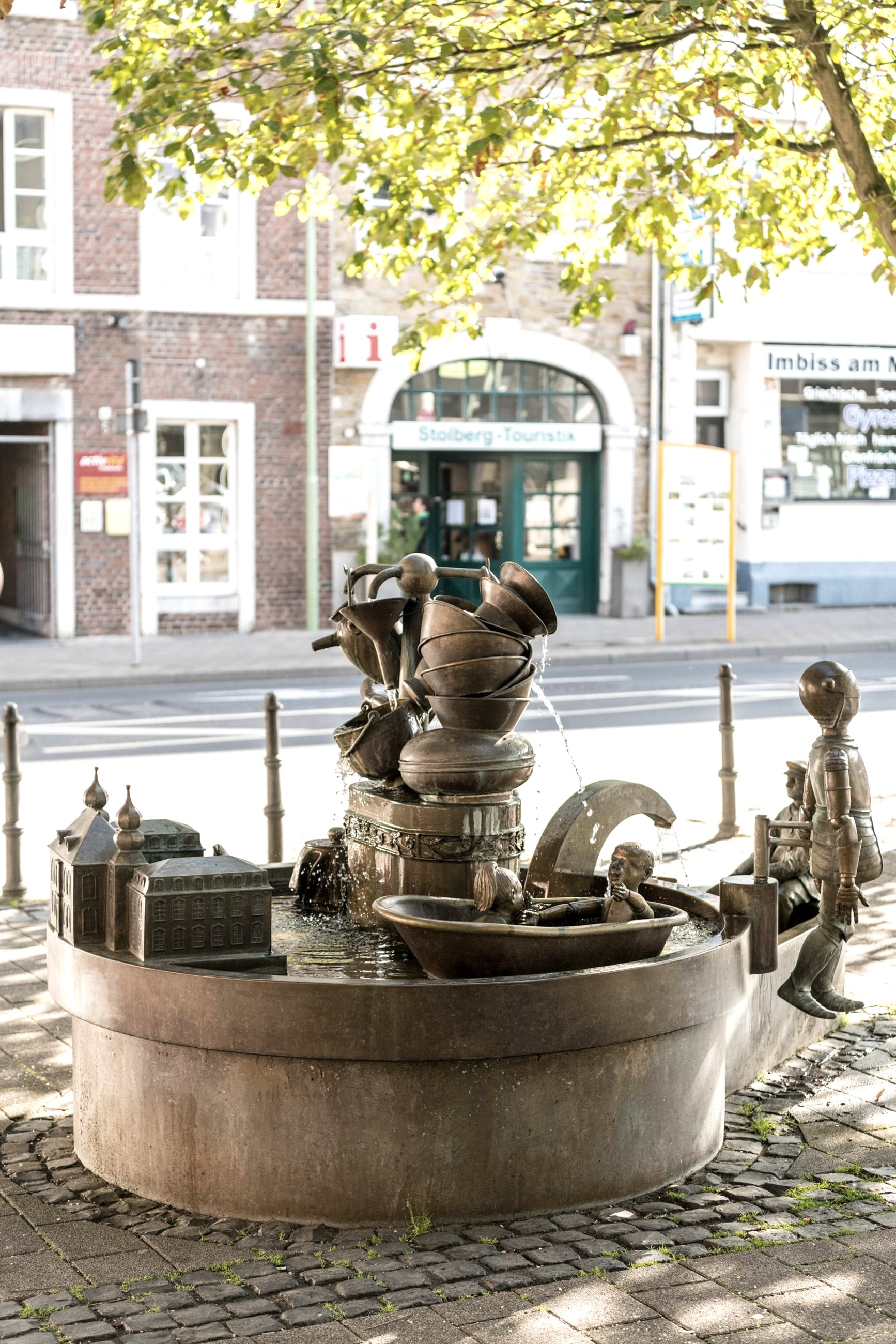 Le célèbre artiste d'Aix-la-Chapelle Bonifatius Stirnberg a réalisé cette œuvre de manière impressionnante, selon les idées de l'initiateur et fondateur, le professeur R. Fuchs, et dans son style unique. Avec une multitude d'éléments individuels différents, la fontaine fait référence à l'histoire locale et à l'histoire de la ville ainsi qu'aux particularités de Stolberg. Les guides ont ainsi l'occasion d'attirer brièvement l'attention de nos visiteurs sur des aspects qui ne font pas l'objet de la visite réservée, mais qui méritent néanmoins d'être brièvement mentionnés. Parmi bien d'autres choses, la figure du nain Galminus fait partie de la composition de la fontaine aux formes multiples. Les nains sont souvent associés à l'exploitation minière médiévale et moderne, et l'image que nous nous faisons de ces petits personnages est fortement influencée par le costume de travail des mineurs du Moyen-Âge. Les nains de Stolberg se situent toutefois dans un tout autre contexte, bien antérieur, et laissent entrevoir une origine celte et romaine. Comme il est très rare de voir des nains à l'état sauvage (en fait, jamais), aucune visite guidée n'est (naturellement) proposée sur ce thème. En revanche, l'office de tourisme de Stolberg propose aux amis et aux amateurs de mythologie (populaire) des conférences sur le sujet. Parmi les particularités présentées figurent également quelques motifs que l'on peut qualifier, selon l'usage actuel, de caractéristiques uniques de la ville de Stolberg. Un batteur de cuivre de Stolberg à la martellerie actionnée par l'eau, l'aspect bien connu d'une cour de cuivre (maison Grünenthal), des récipients typiques en laiton, des cuves en zinc, des boutons-pression et des violettes en galme, tous ces exemples sont des particularités spécifiques à la région que l'on ne peut admirer que dans la région et nulle part ailleurs. Après un appel à nommer la fontaine dans la presse locale et les propositions reçues, le terme Galminusbrunnen a été choisi pour nommer la nouvelle œuvre d'art attrayante au pied de la vieille ville de Stolberg. Le terme Galminus fait référence à un personnage nain qui fait également partie de la composition riche en formes de la fontaine.