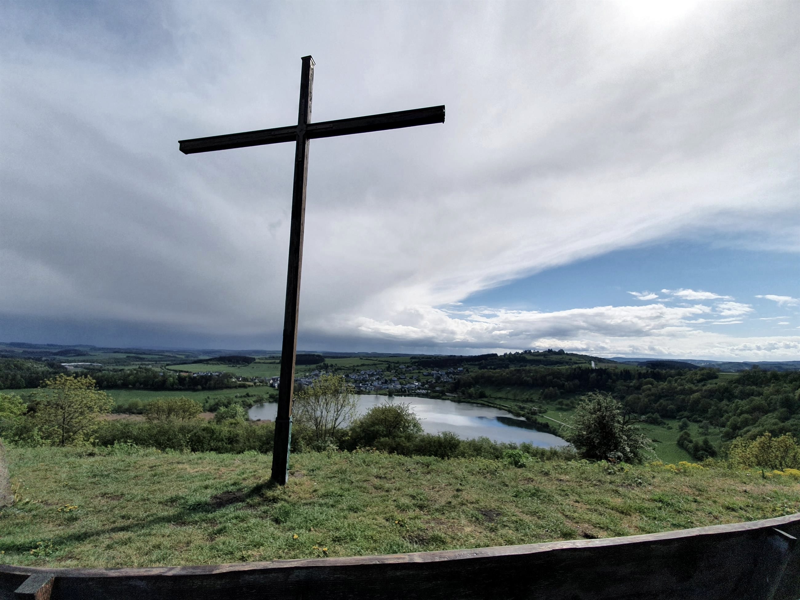 Au-dessus du Schalkenmehrener Maar se dresse une croix au sommet à 534,5 mètres au-dessus du niveau de la mer. Comme toute chose, cette croix a une histoire et elle ne se trouve plus à son emplacement d'origine.
