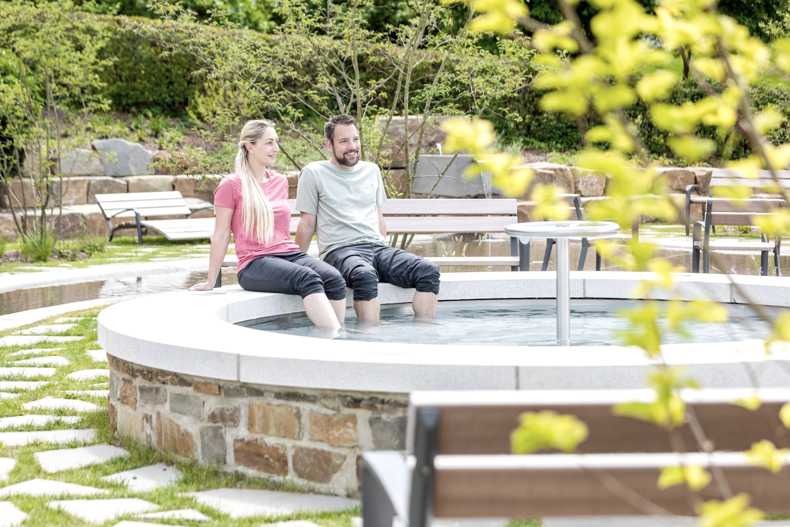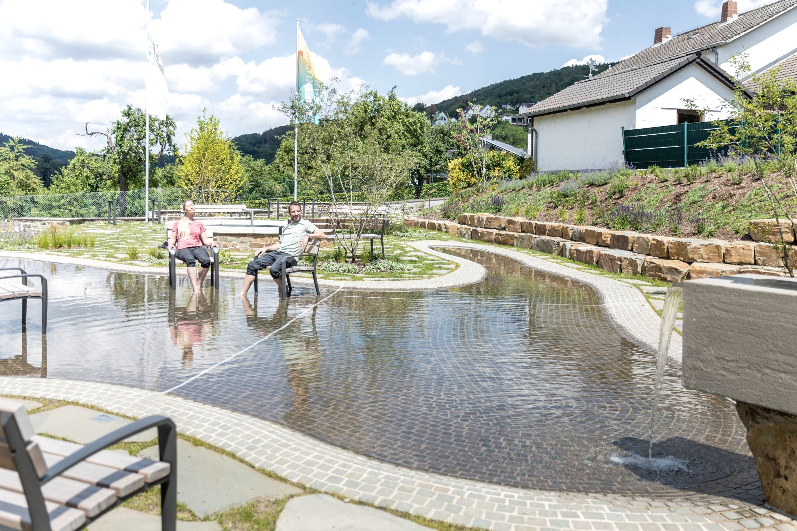 Différents éléments liés à l'eau invitent à se rafraîchir, à se détendre et à se reposer après une longue randonnée à vélo ou à pied ou tout simplement par une chaude journée. La grande surface d'eau praticable ainsi qu'un petit bassin avec un bord pour s'asseoir permettent de se rafraîchir les pieds fatigués et un bassin supplémentaire en pierre permet de se rafraîchir les bras. Outre ces éléments, le charmant espace vert récemment aménagé offre suffisamment de possibilités de s'asseoir pour se reposer et passer un moment agréable.