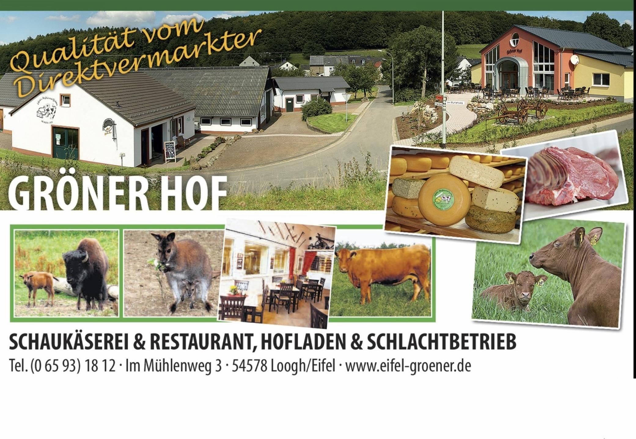 Gröner Hof, Eifeler Hofkäserei und Schlachtbetrieb, Betriebsführungen, Schaukäserei, Hofladen, Restaurant.