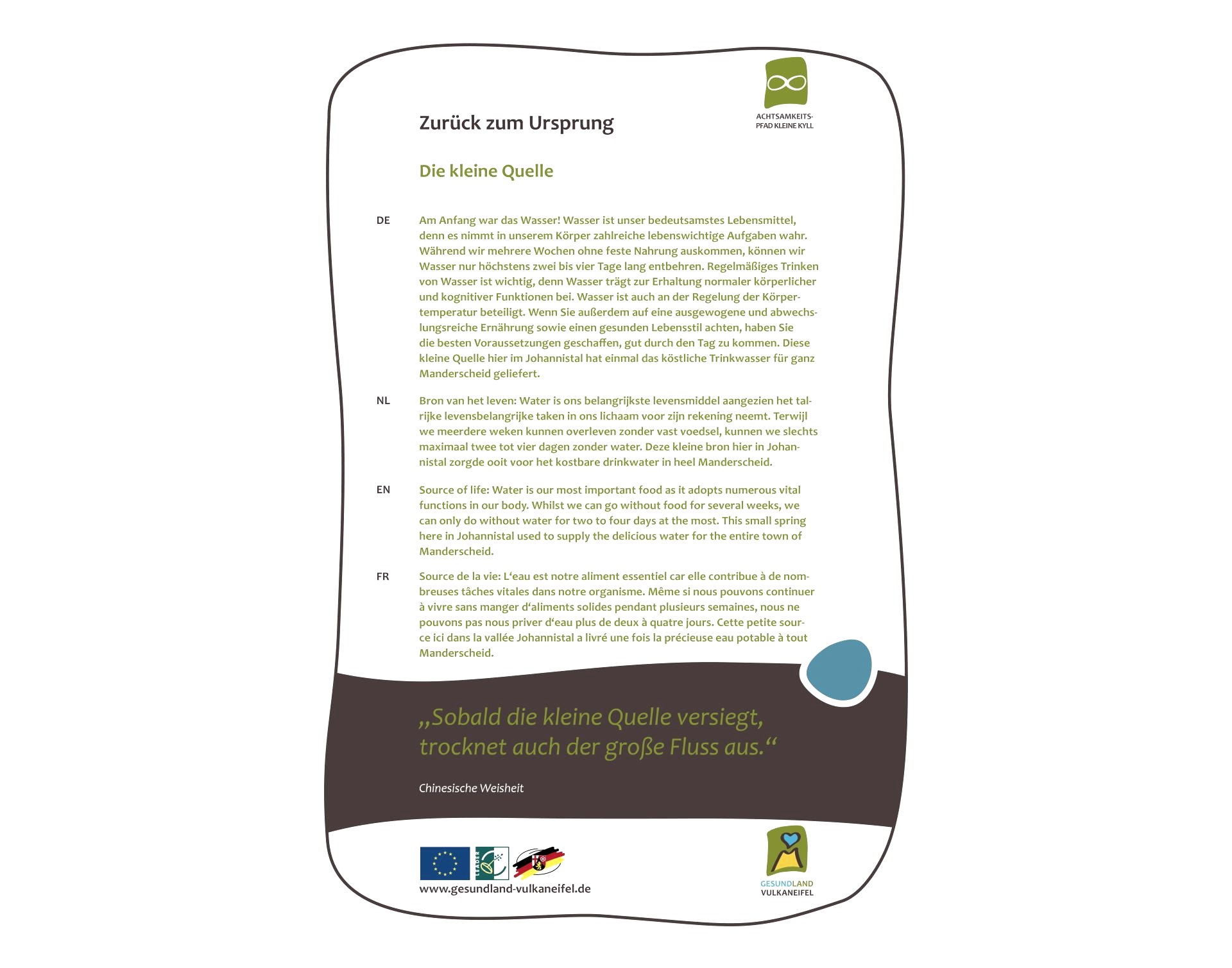 Mocht u een beker bij u hebben, dan kunt u hier moeiteloos het water uit de bron opvangen en opdrinken. Doe dit bewust en stel uzelf de vraag: Hoe smaakt dit water?