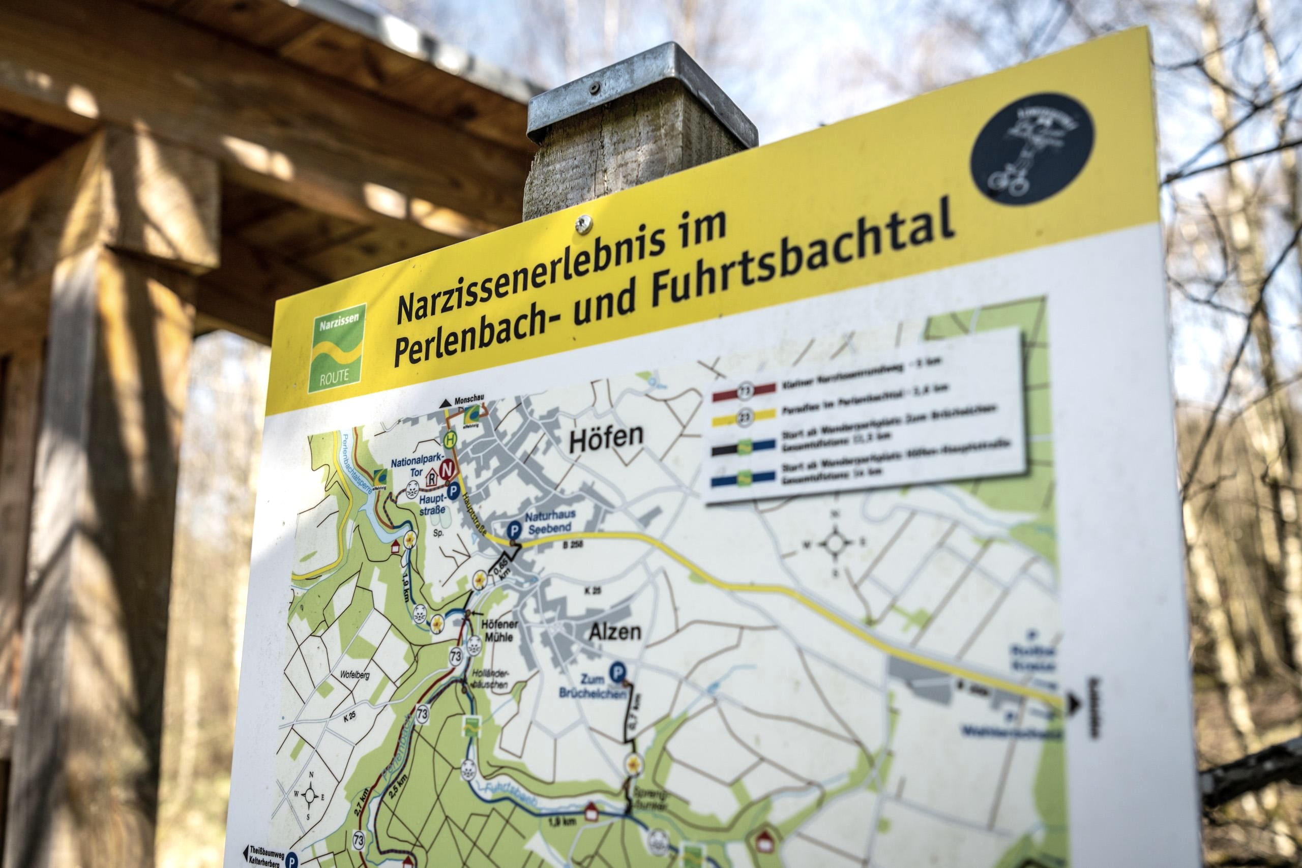 - De grote narcissen-rondwandeling is een 14 km lange wandeling en begint op de parkeerplaats van de Höfen-hoofdstraat (bij Naturhaus Seebend, Hauptstr. 123, Monschau-Höfen). Een iets kortere route - 11,5 kilometer - begint bij de parkeerplaats voor wandelaars "Zum Brüchelchen" (Alzerplatzweg 20, Monschau-Höfen). Beide paden leiden door het Fuhrtsbachdal.