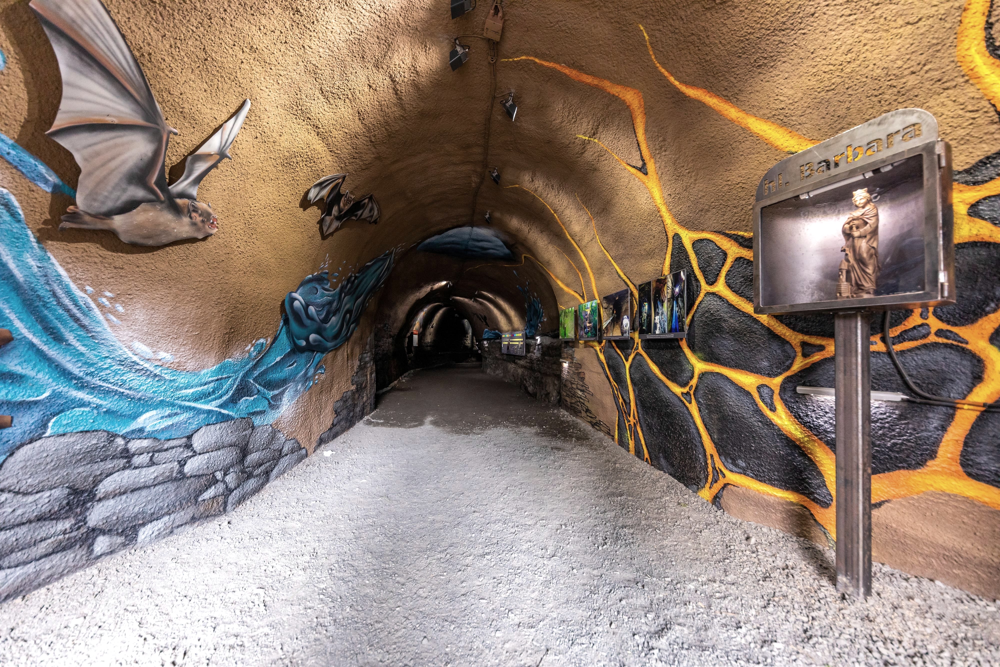 Wie de tunnel aan de kant van de Jungferweiher betreedt, zal meteen versteld staan: een artistieke graffiti siert de ingang en illustreert het ontstaan van de maaren. Hier ontmoet ijskoud water gloeiend rood magma, koude ontmoet hitte en ontlaadt zich in een gigantische explosie.