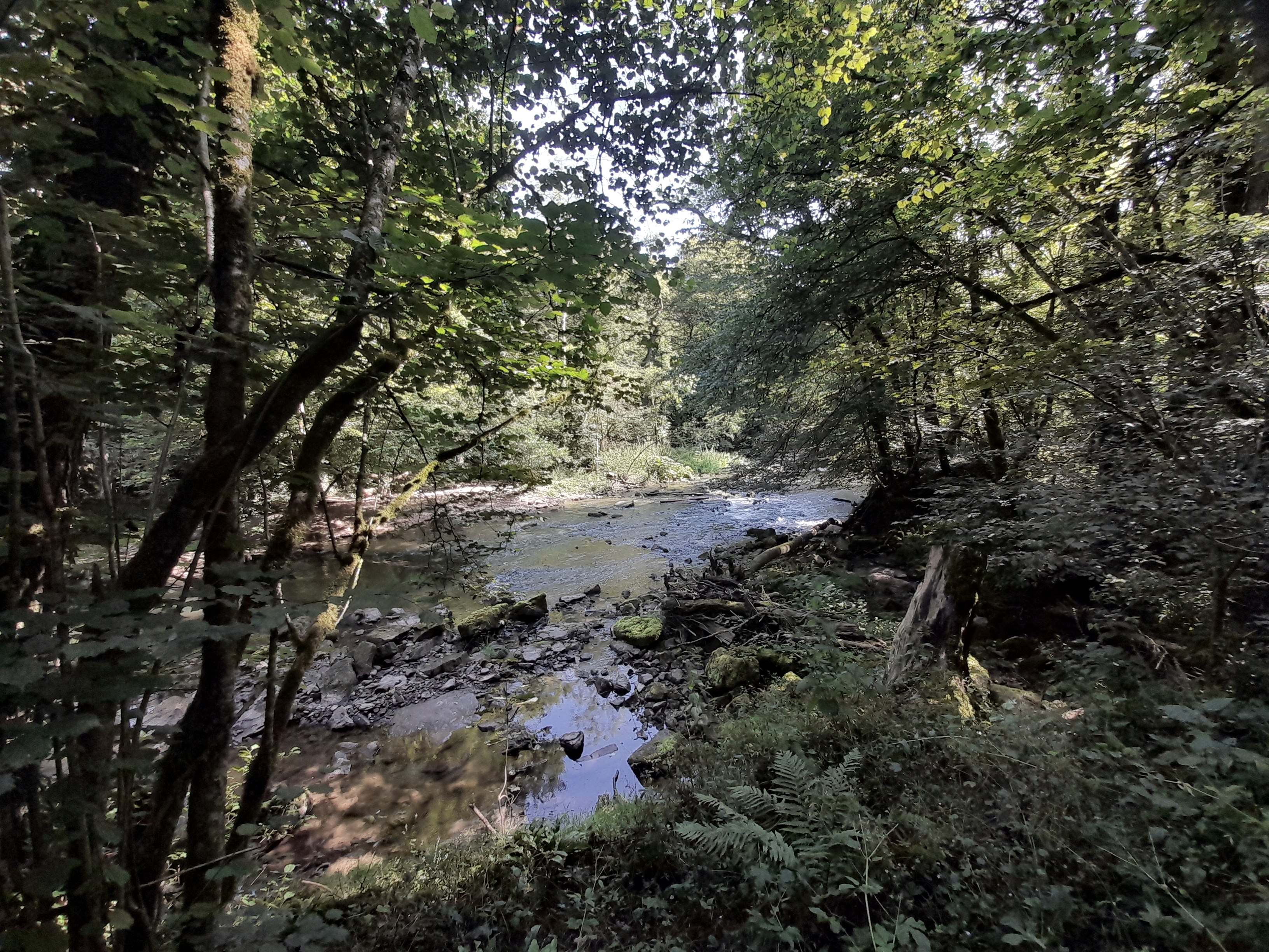 Door het ``Schlosspark``, langs de Syr, een waterval over het natuurgebied `` Manternacher Fiels`` leidt deze pad.