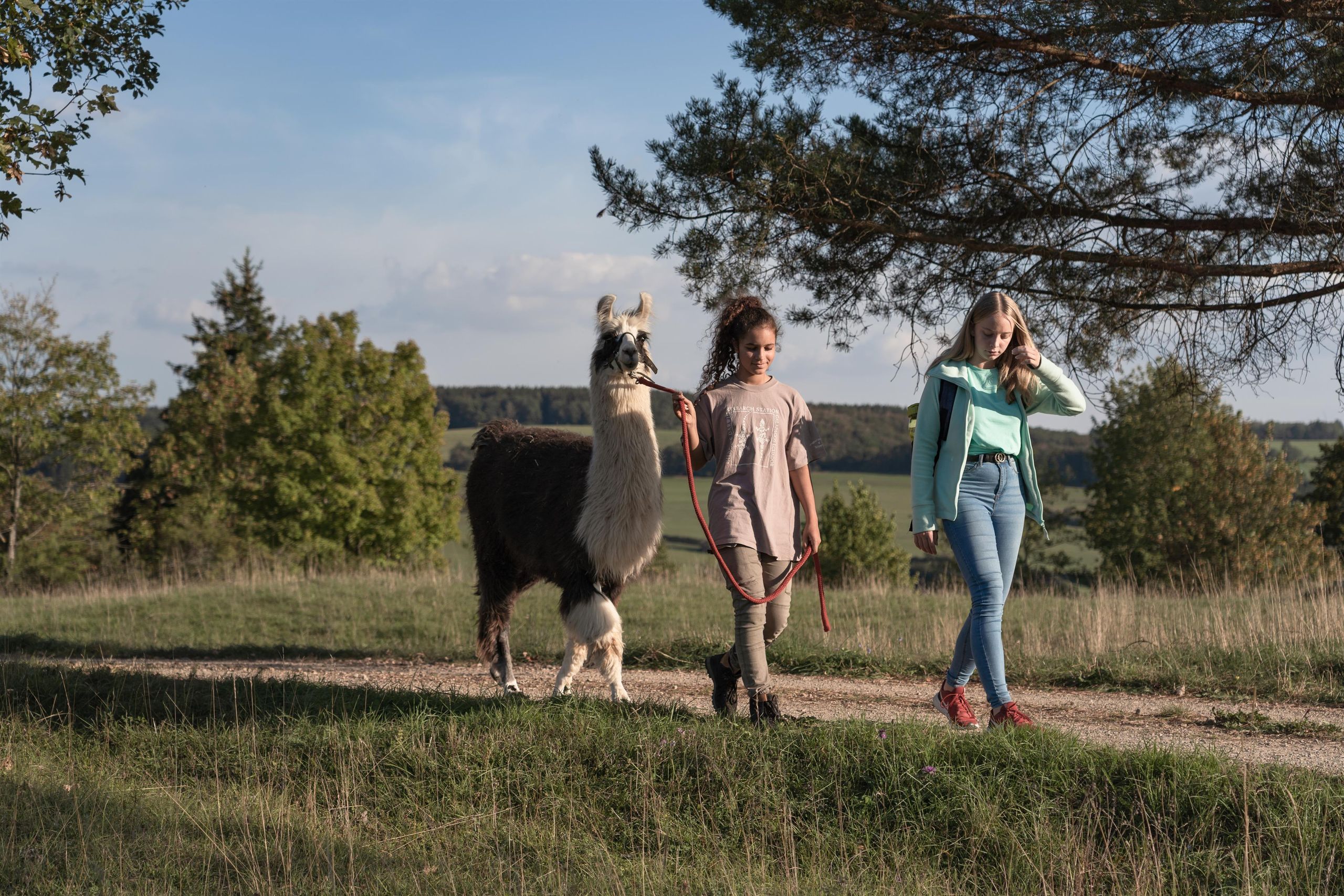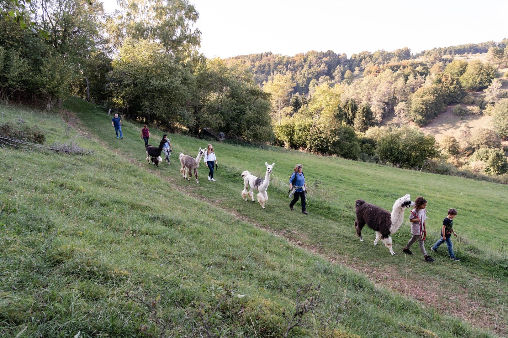 Onze lama's grazen direct onder de kasteelruïne Schönecken op een weideboomgaard. Daar leren we de dieren op een zeer ontspannen manier kennen en doen we onze eerste pogingen om door de wei geleid te worden. Dan begint ons wandelavontuur in het natuurreservaat Schönecker Zwitserland!
