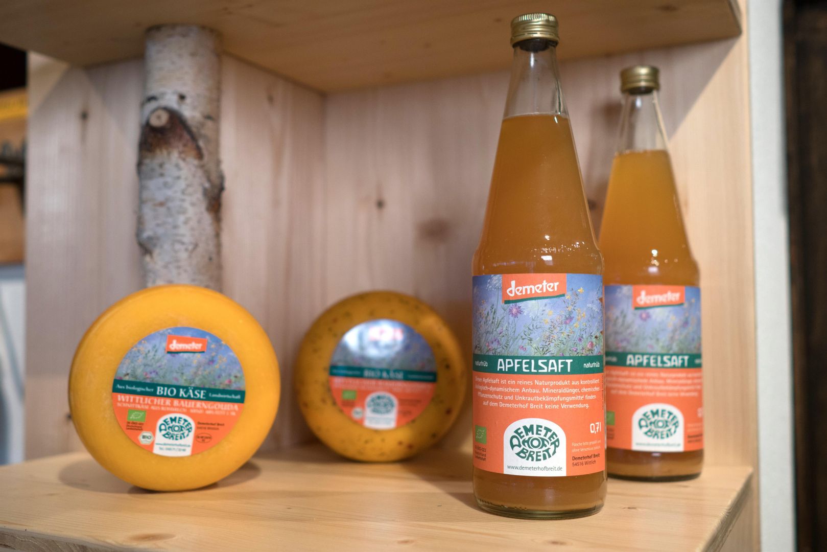 Het leven pulseert op Demeterhof Breit! Het samenspel van landbouw, veeteelt, tuinbouw, boerderijwinkel en vereniging zorgt voor een bijzondere sfeer en is een voorwaarde voor het model van duurzame landbouw. Steeds meer mensen ontdekken de boerderij aan de rand van Wittlich als een plek om te winkelen, te beleven en te genieten. De boerderijwinkel verkoopt veel eigen producten, zoals kaas en kwark uit de kaasmakerij, eieren, verse groenten van de boerderij en natuurlijk troebel appelsap uit de omliggende boomgaarden, maar ook tal van andere biologische producten uit de regio. Zoals geitenkaas van de Steinrausch boerderij in Wascheid/Eifel en brood van bakkerij Utters in Dockweiler. Het gevarieerde aanbod in de boerderijwinkel wordt gecompleteerd door meer dan 400 verschillende natuurlijke levensmiddelen, zoals thee, broodbeleg, meel, pasta en nog veel meer.
