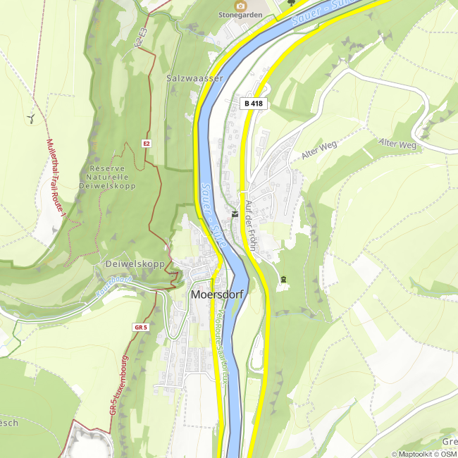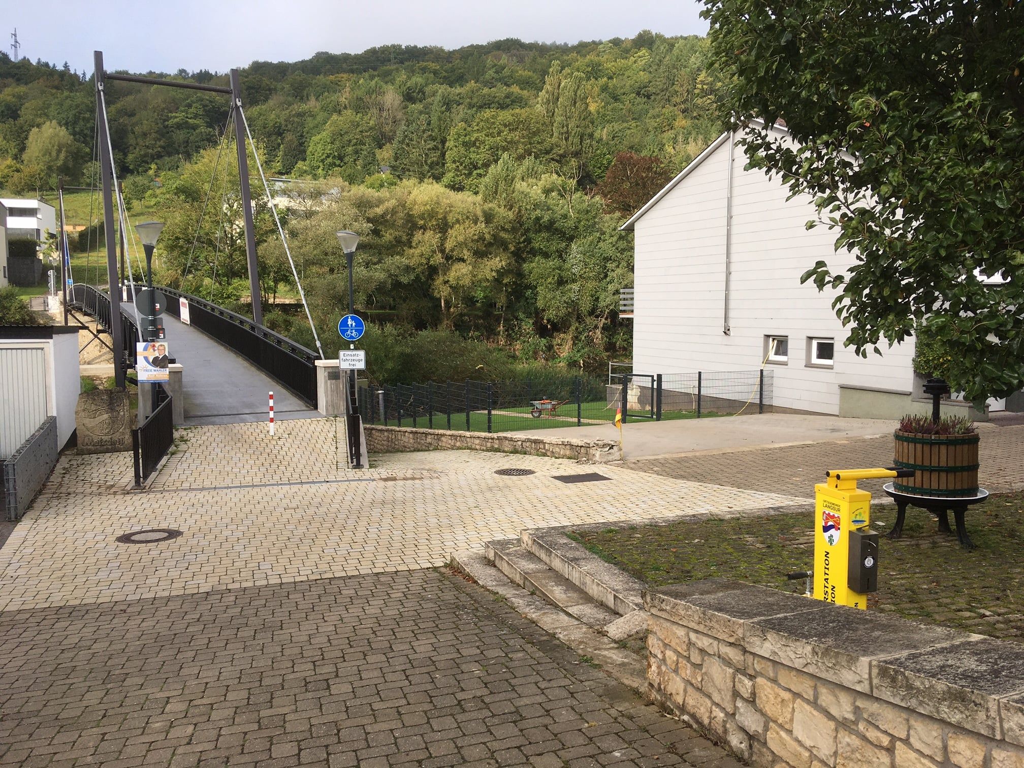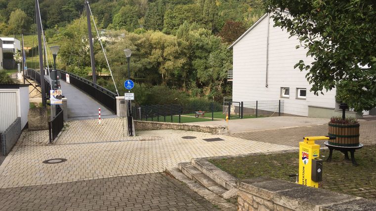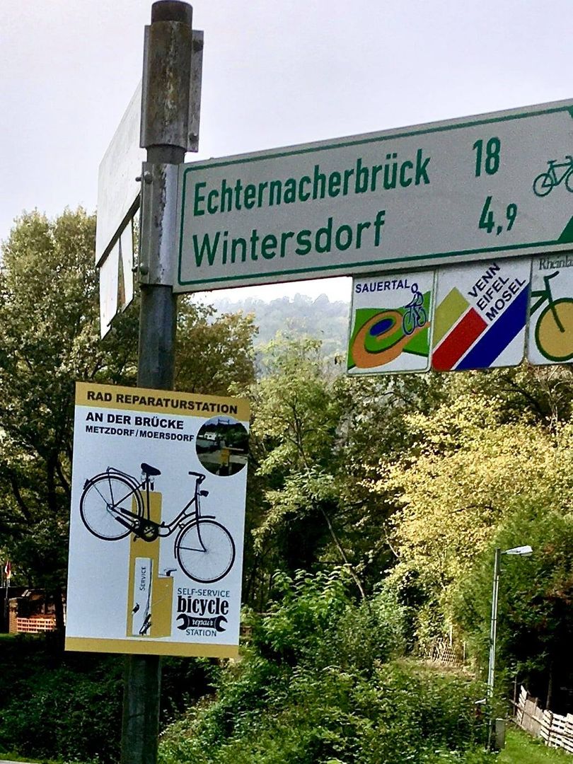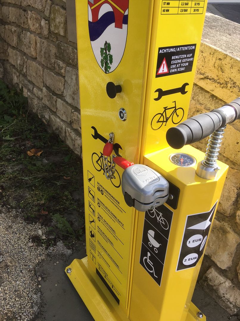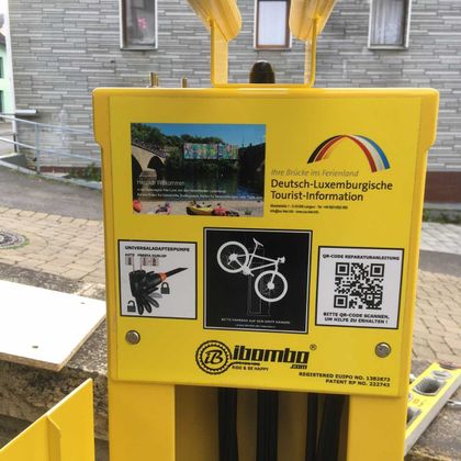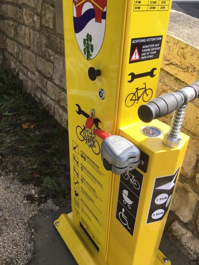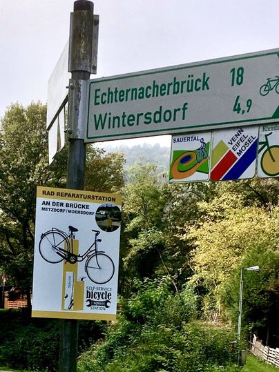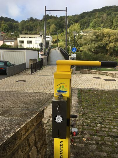 De fietsreparatiewerkplaats op het Sauertal fietspad bevindt zich bij het bruggenhoofd van de fiets- en voetgangersbrug Metzdorf (D) / Moersdorf (L).