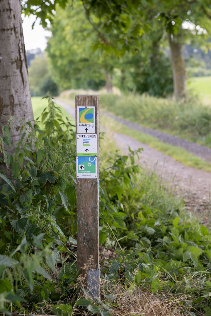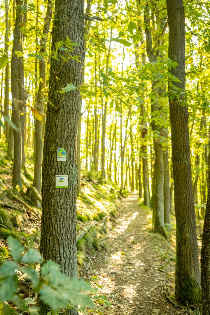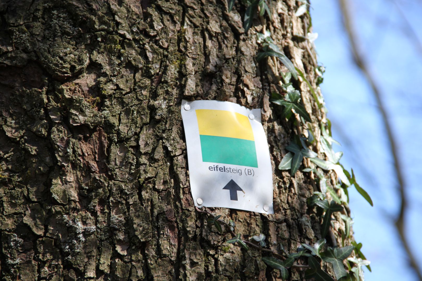 Het Eifelsteig-logomarkeert de weg langs de hele route.