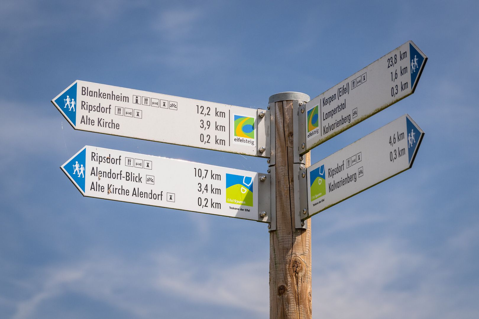 De wegwijzers op de Eifelsteig hebben een blauwe punt. Sommige borden zijn aangevuld met het logo van de Eifelsteig en de logo's van de partnerroutes.