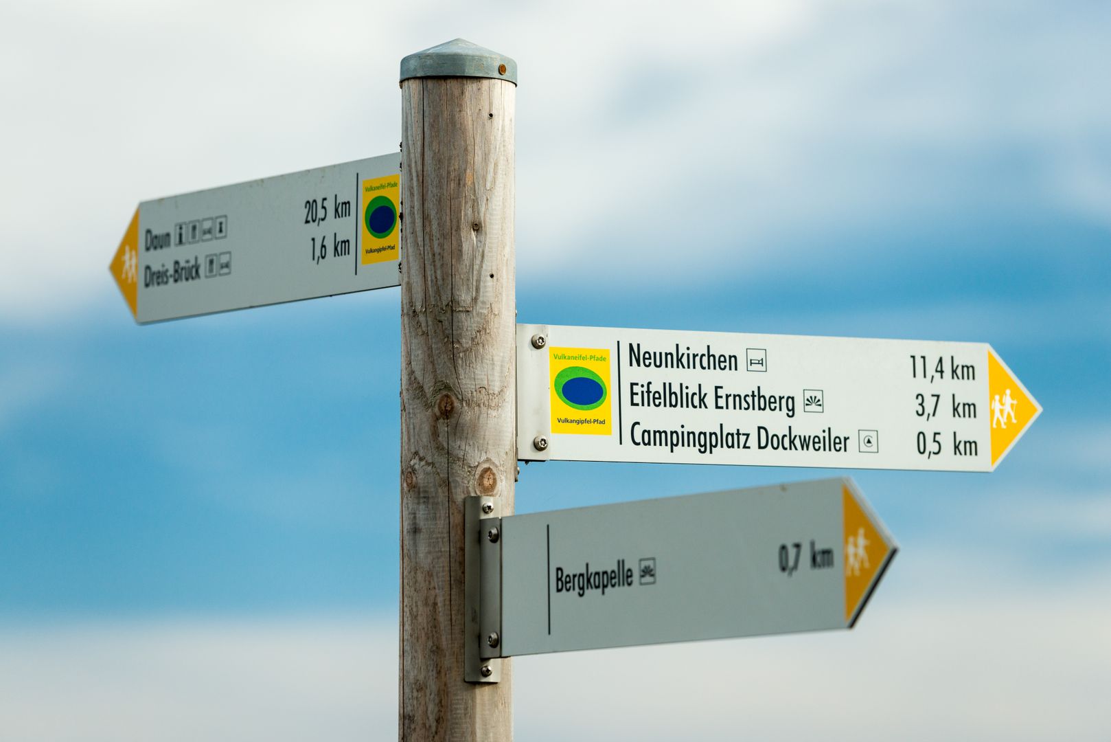 In tegenstelling tot de Eifelsteig hebben de wegwijzers van de partnerpaden en de toegangswegen naar de Eifelsteig een gele punt.