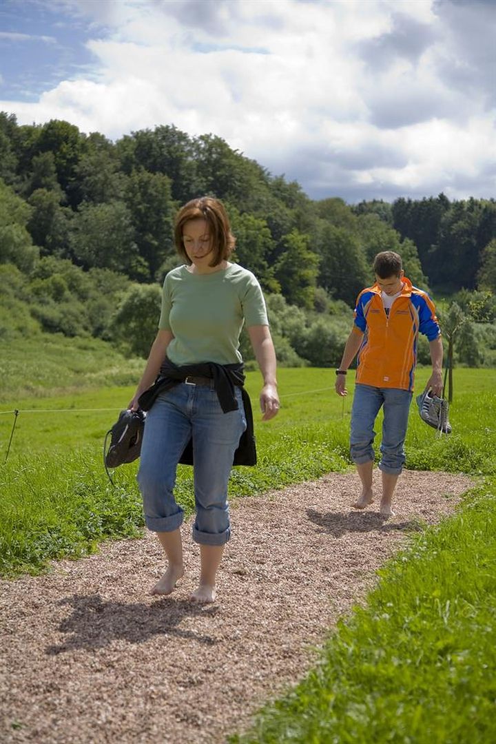 Het Barfußpfad is 1,5 kilometer lang en heeft 22 verschilende soorten ondergronden (kiezels, water, lavazand etc.).