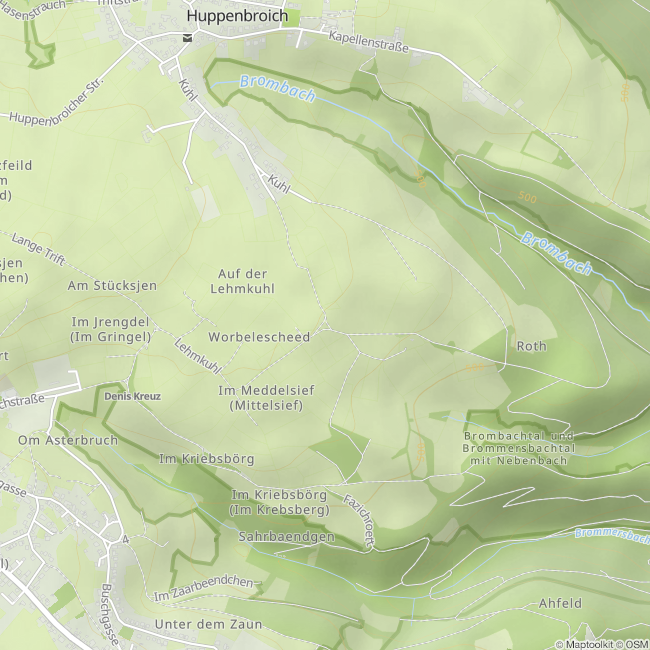 Vanaf de parkeerplaats bij de kapel in Huppenbroich (50.589927, 6.316547) loopt de route door het dorp en vervolgens over een verharde, meestal vlakke veldweg.