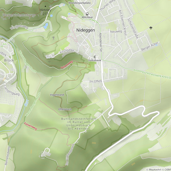 Ongeveer 200 routes wachten op liefhebbers van buitenklimmen in het dal van de Rur. De klimmassieven van glanzend rood zandsteen zijn tussen de 10 en 45 meter hoog en elke route gaat steil omhoog. De kiezels die uit de zandsteen steken bieden meestal goede houvast en voetsteunen. Hirtzley, Effels en Hinkelsteine zijn de namen van de rotsen bij Nideggen waar je je kracht en behendigheid kunt testen. Als bizarre en imposante verschijnselen zijn ze zowel een vrijetijdsattractie als onderdeel van een gevoelige habitat. Er leven bijvoorbeeld oehoes, muurhagedissen en vleermuizen. Om hen te beschermen is het aantal beklimmingen beperkt en gelden de onderstaande klimregels.
